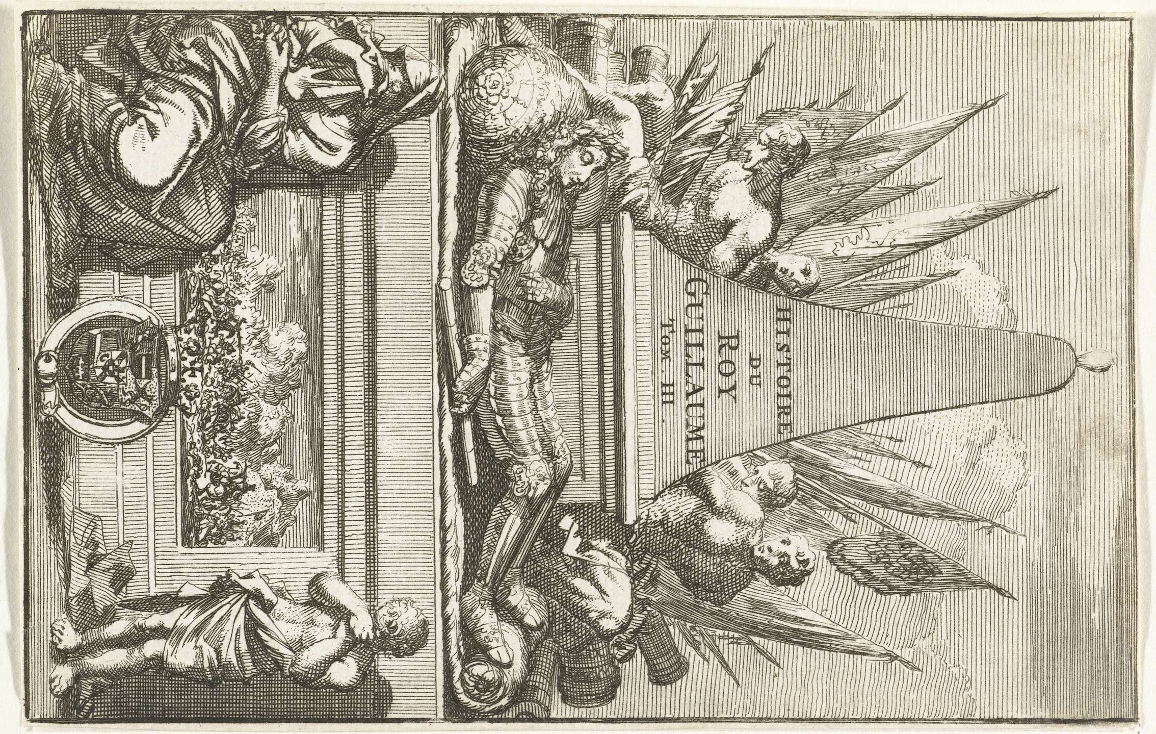 Titelblad voor: Histoire de Guillaume III (deel III), 1703. Allegorische voorstelling met het lichaam van koning Willem III liggend in wapenrusting op het grafmonument. Achter het monument vaandels, wapens en overwonnen volken, vooraan een treurende vrouw en kind.