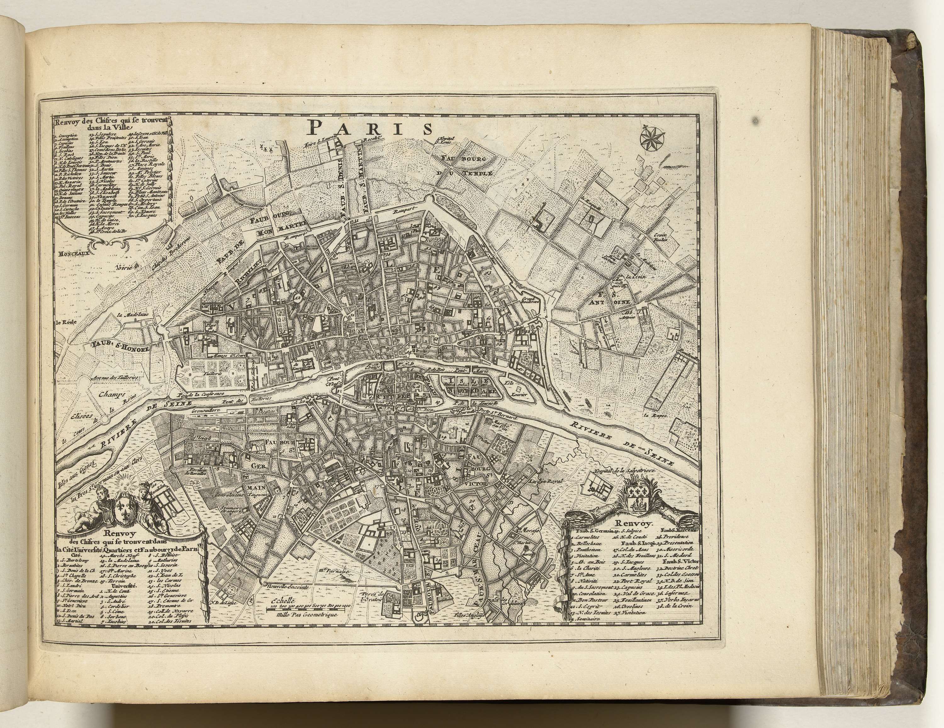 Plattegrond van de Franse hoofdstad Parijs. Onderdeel van het vijfde deel (1696) van het prentwerk waarin gebundeld zijn de acht delen van Les forces de l'Europe uitgegeven tussen 1693-1697. Het prentwerk bestaat uit 175 platen met plannen (afkomstig van Sébastien Le Prestre, Seigneur de Vauban) van vermaarde sterke steden en vestingen in de Negenjarige Oorlog. ...