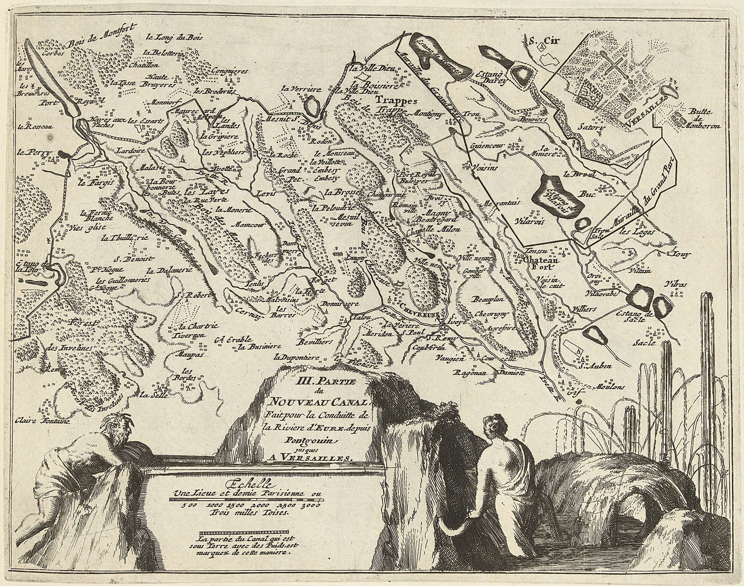 Kaart van het nieuwe kanaal dat water van de rivier de Eure leidt van Pontgouin naar Versailles (deel III), ca. 1693-1696. Met waternimf en riviergod bij een bron. Onderdeel van het vijfde deel (1696) van het prentwerk waarin gebundeld zijn de acht delen van Les forces de l'Europe uitgegeven tussen 1693-1697. Het prentwerk bestaat uit ...