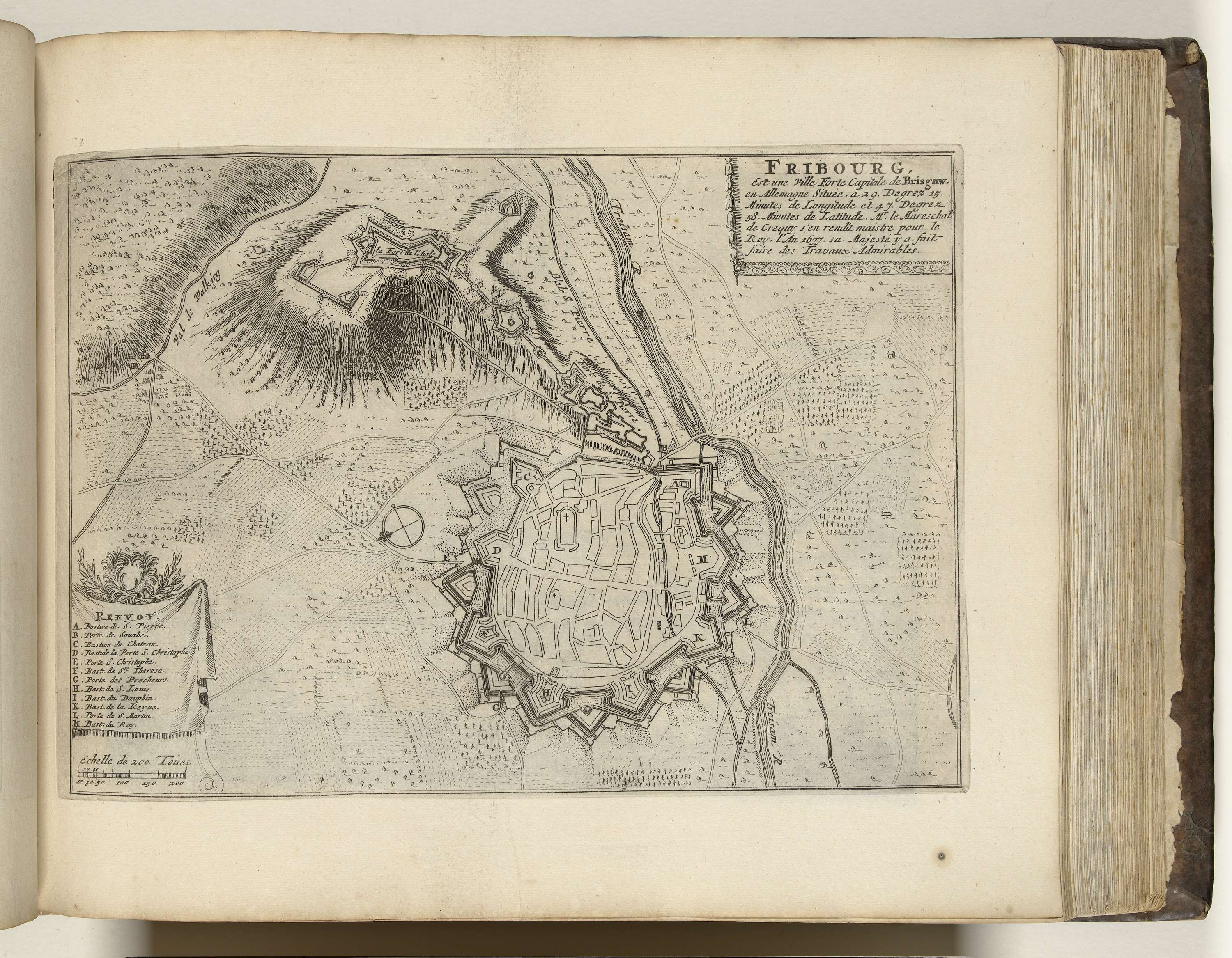 Plattegrond van de versterkingen om de Zwitserse stad Fribourg. Onderdeel van het vijfde deel (1696) van het prentwerk waarin gebundeld zijn de acht delen van Les forces de l'Europe uitgegeven tussen 1693-1697. Het prentwerk bestaat uit 175 platen met plannen (afkomstig van Sébastien Le Prestre, Seigneur de Vauban) van vermaarde sterke steden en vestingen in ...