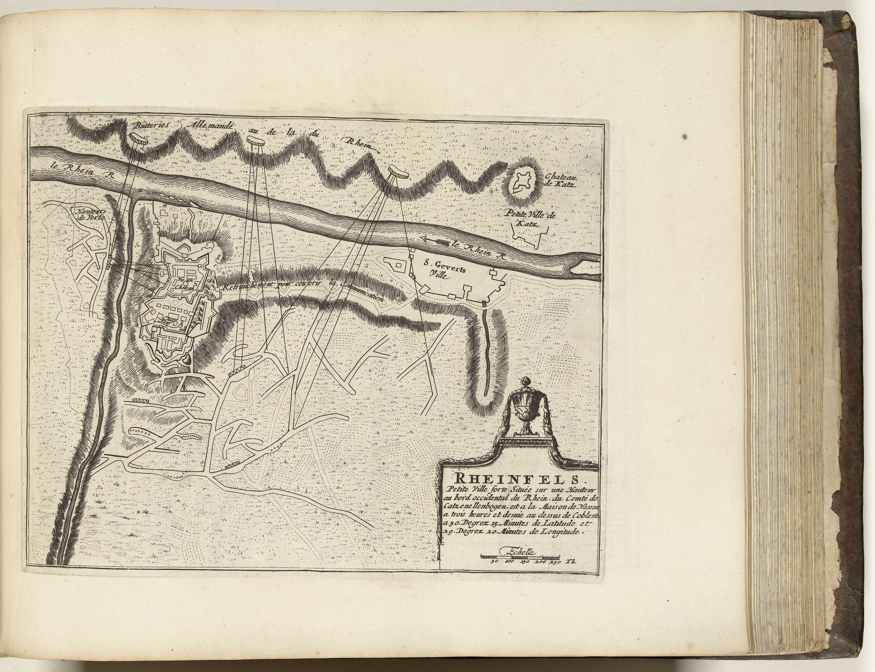 Plattegrond met het ontzet van Rheinfels (dat belegerd werd door de Fransen) door Duitse troepen, januari 1693. Onderdeel van het vijfde deel (1696) van het prentwerk waarin gebundeld zijn de acht delen van Les forces de l'Europe uitgegeven tussen 1693-1697. Het prentwerk bestaat uit 175 platen met plannen (afkomstig van Sébastien Le Prestre, Seigneur de ...