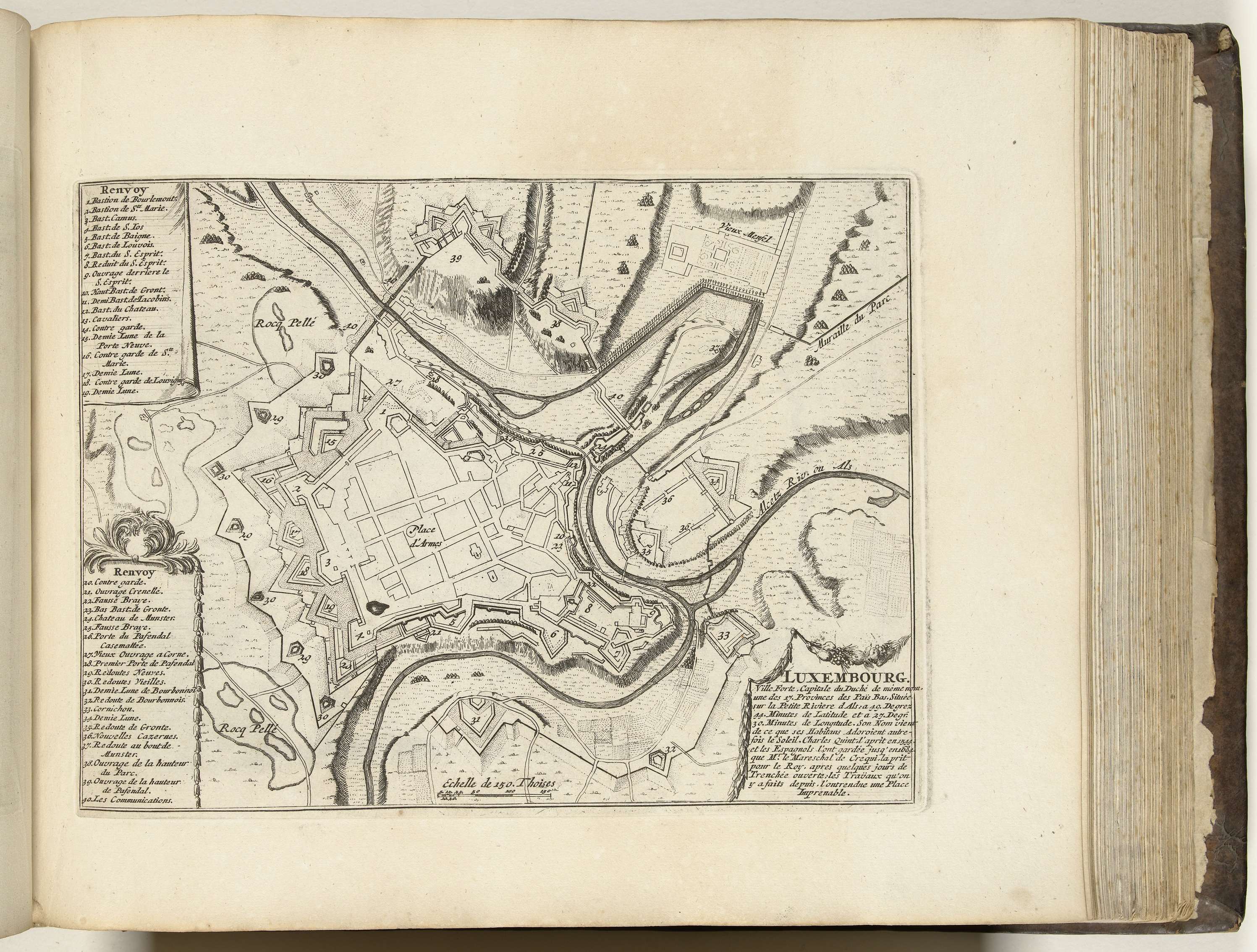 Plattegrond van de versterkingen om de stad Luxemburg. Onderdeel van het vijfde deel (1696) van het prentwerk waarin gebundeld zijn de acht delen van Les forces de l'Europe uitgegeven tussen 1693-1697. Het prentwerk bestaat uit 175 platen met plannen (afkomstig van Sébastien Le Prestre, Seigneur de Vauban) van vermaarde sterke steden en vestingen in de ...