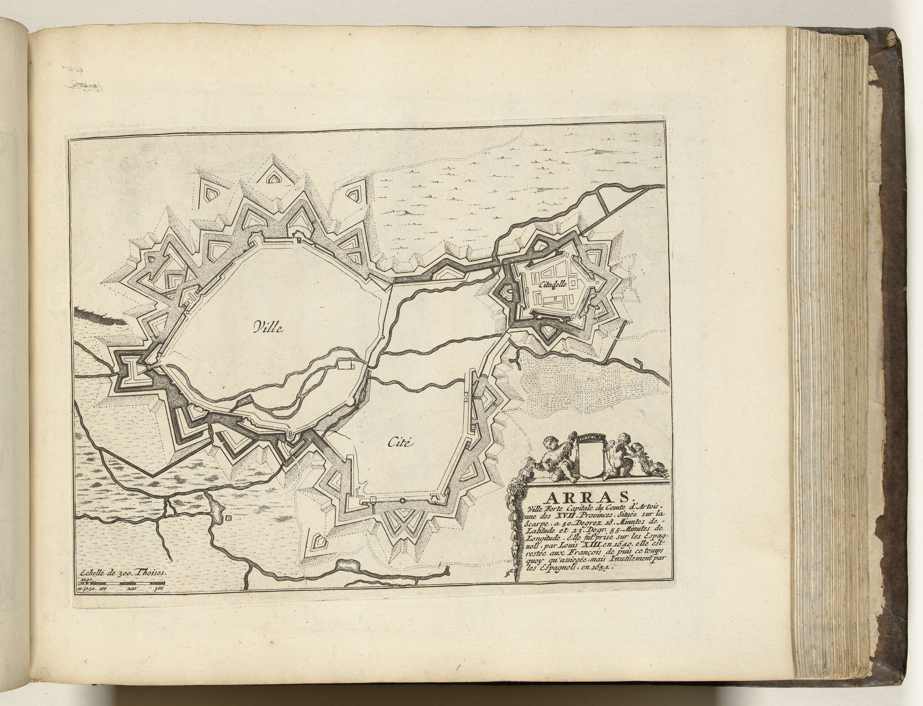 Plattegrond van de versterkingen om de Zuid-Nederlandse stad Arras (Atrecht). Onderdeel van het vijfde deel (1696) van het prentwerk waarin gebundeld zijn de acht delen van Les forces de l'Europe uitgegeven tussen 1693-1697. Het prentwerk bestaat uit 175 platen met plannen (afkomstig van Sébastien Le Prestre, Seigneur de Vauban) van vermaarde sterke steden en vestingen ...