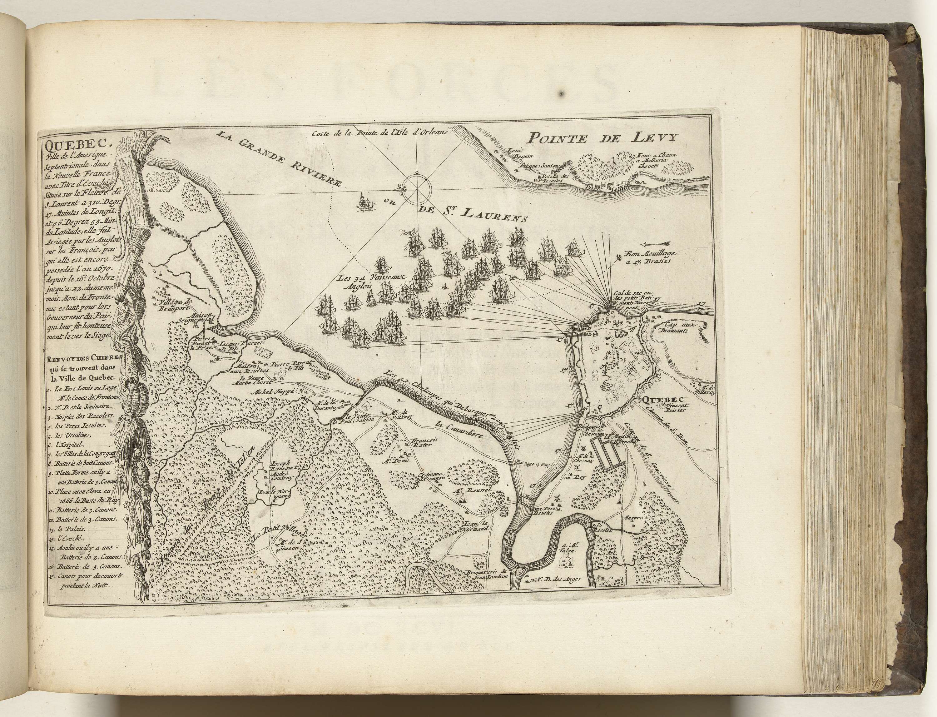 Aanval door Engelse schepen op de Fransen in de stad Québec, de aanval wordt afgeslagen, 16-22 oktober 1690. Kaart van Québc en omgeving met de Engelse vloot op de Saint Lawrencerivier voor de stad. Onderdeel van het vijfde deel (1696) van het prentwerk waarin gebundeld zijn de acht delen van Les forces de l'Europe uitgegeven ...