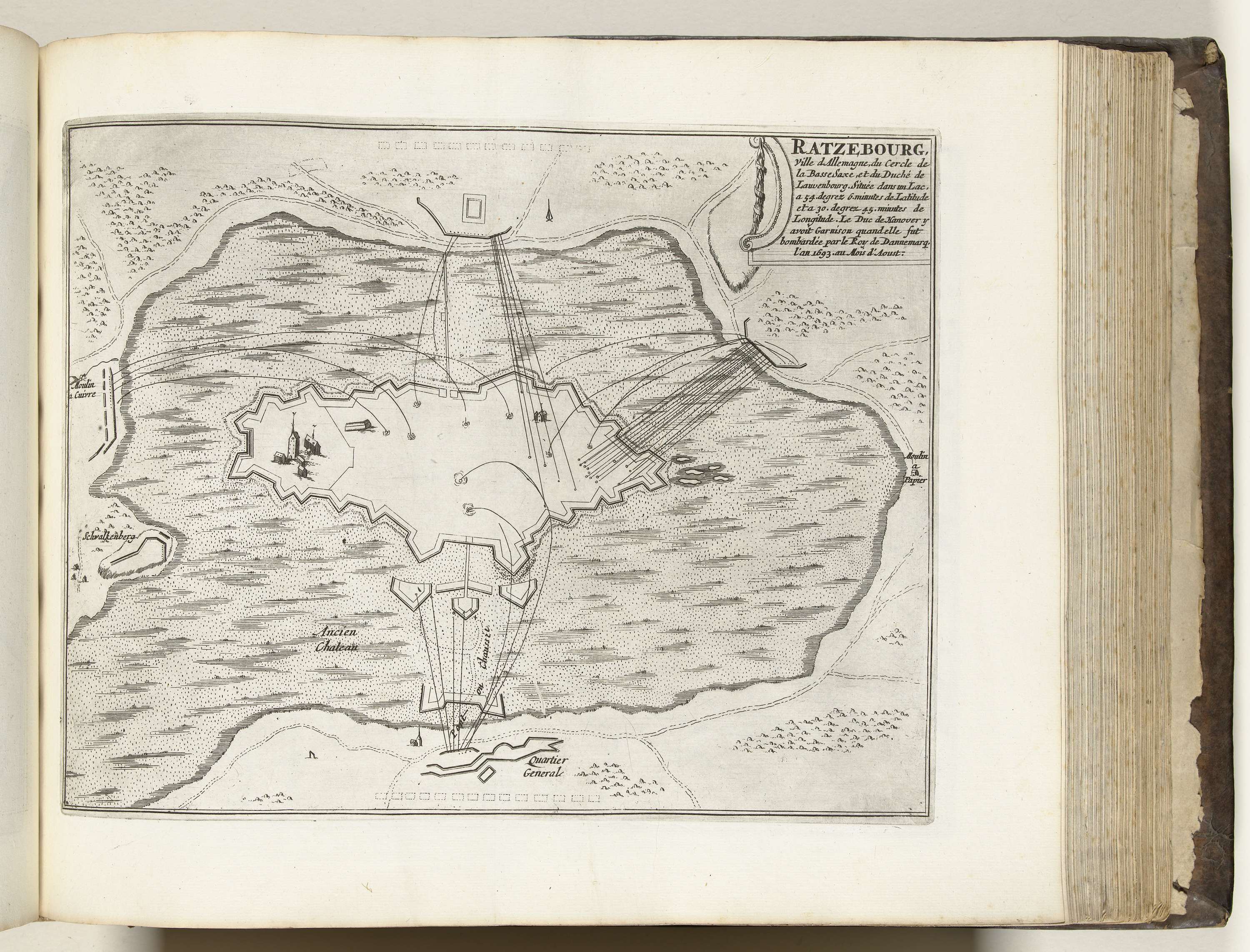 Bombardement van de stad Ratzeburg in Sleeswijk-Holstein door het Deense leger onder Christiaan V, van augustus 1693 tot april 1694. Onderdeel van het zesde deel (1696) van het prentwerk waarin gebundeld zijn de acht delen van Les forces de l'Europe uitgegeven tussen 1693-1697. Het prentwerk bestaat uit 175 platen met plannen (afkomstig van Sébastien Le ...