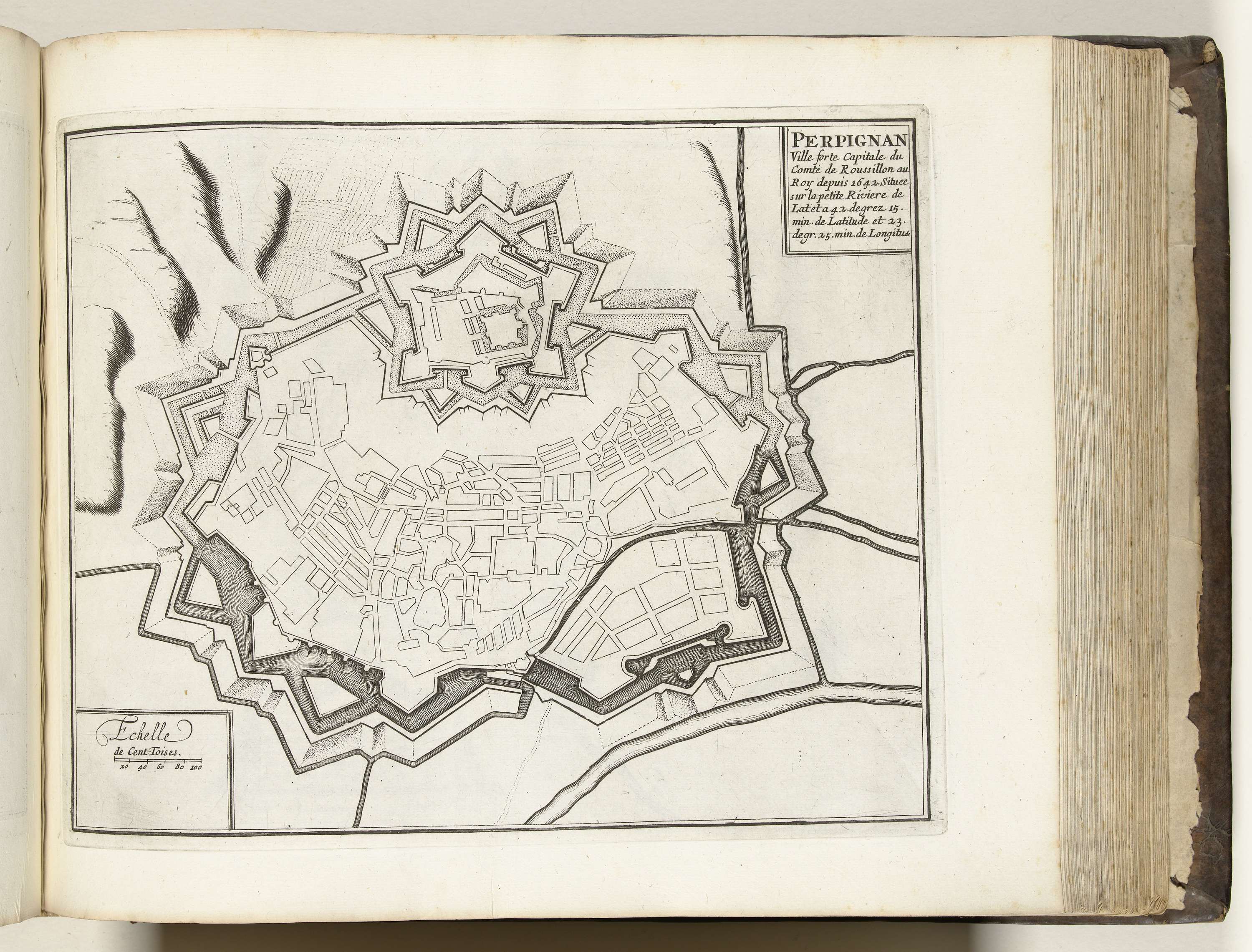 Plattegrond van de versterkingen om de Franse stad Perpignan. Onderdeel van het zesde deel (1696) van het prentwerk waarin gebundeld zijn de acht delen van Les forces de l'Europe uitgegeven tussen 1693-1697. Het prentwerk bestaat uit 175 platen met plannen (afkomstig van Sébastien Le Prestre, Seigneur de Vauban) van vermaarde sterke steden en vestingen in ...