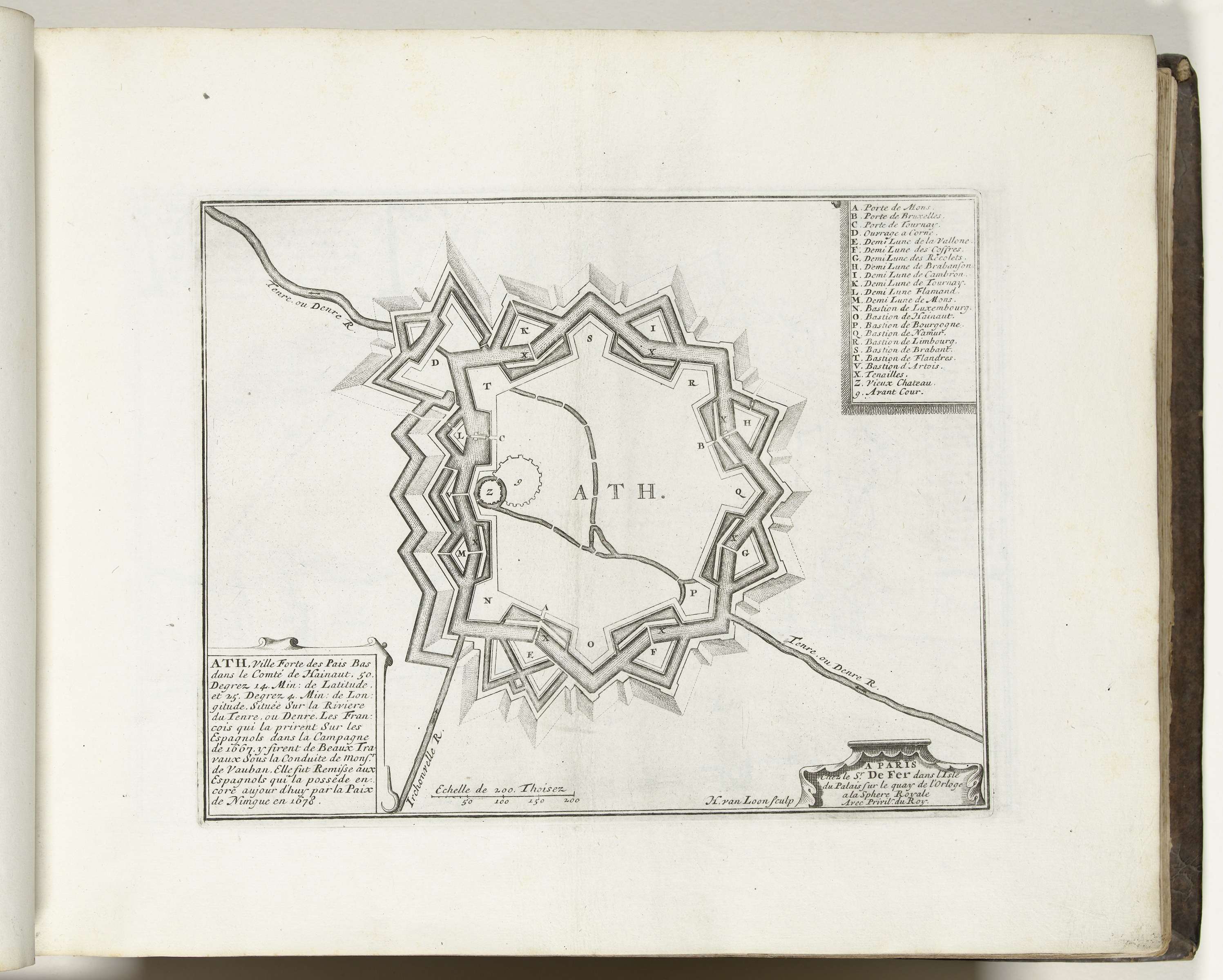Plattegrond van de fortificaties rond de stad Ath. Onderdeel van het eerste deel (1693) van het prentwerk waarin gebundeld zijn de acht delen van Les forces de l'Europe uitgegeven tussen 1693-1697. Het prentwerk bestaat uit 175 platen met plannen (afkomstig van Sébastien Le Prestre, Seigneur de Vauban) van vermaarde sterke steden en vestingen in de ...
