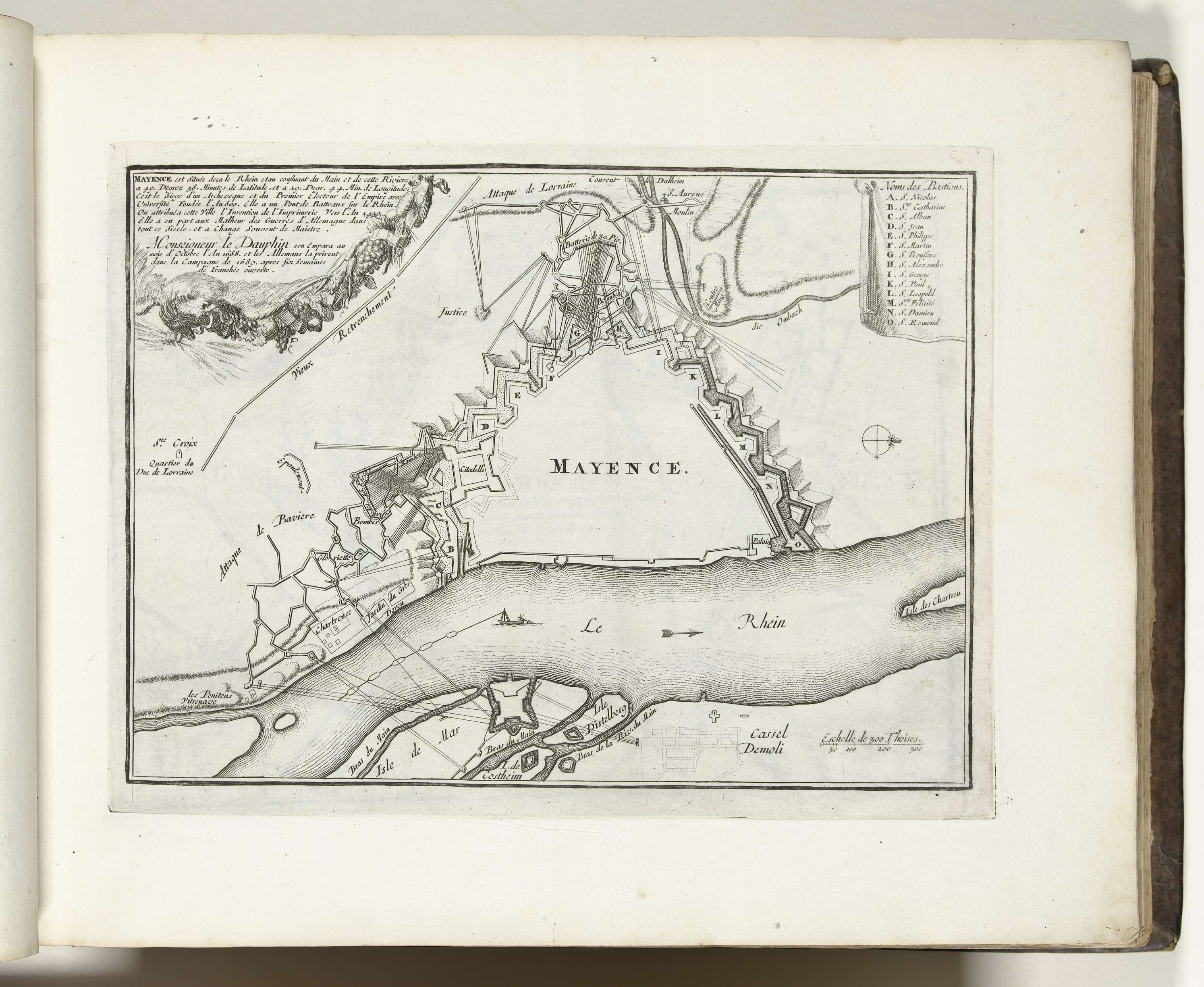 Plattegrond van de fortificaties rond de stad Mainz. Onderdeel van het eerste deel (1693) van het prentwerk waarin gebundeld zijn de acht delen van Les forces de l'Europe uitgegeven tussen 1693-1697. Het prentwerk bestaat uit 175 platen met plannen (afkomstig van Sébastien Le Prestre, Seigneur de Vauban) van vermaarde sterke steden en vestingen in de ...