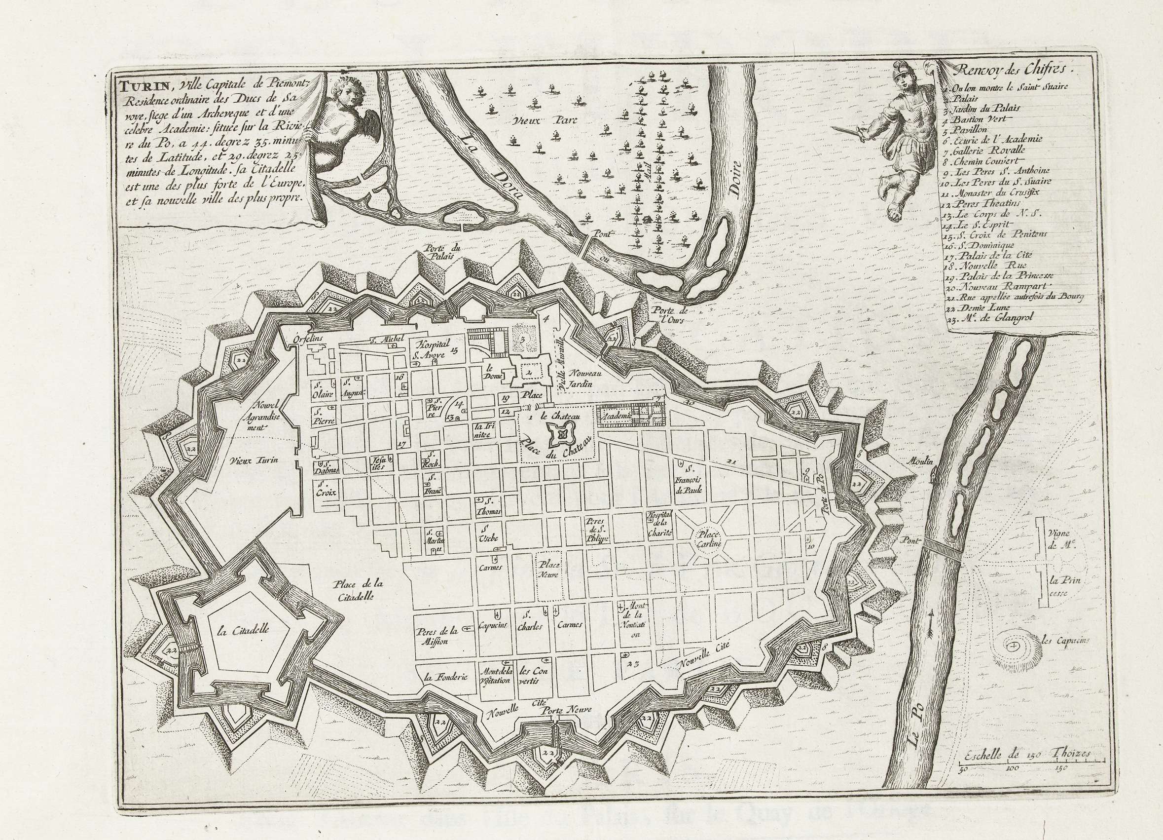Plattegrond van Turijn en de fortificaties rond de stad. Onderdeel van het eerste deel (1693) van het prentwerk waarin gebundeld zijn de acht delen van Les forces de l'Europe uitgegeven tussen 1693-1697. Het prentwerk bestaat uit 175 platen met plannen (afkomstig van Sébastien Le Prestre, Seigneur de Vauban) van vermaarde sterke steden en vestingen in ...