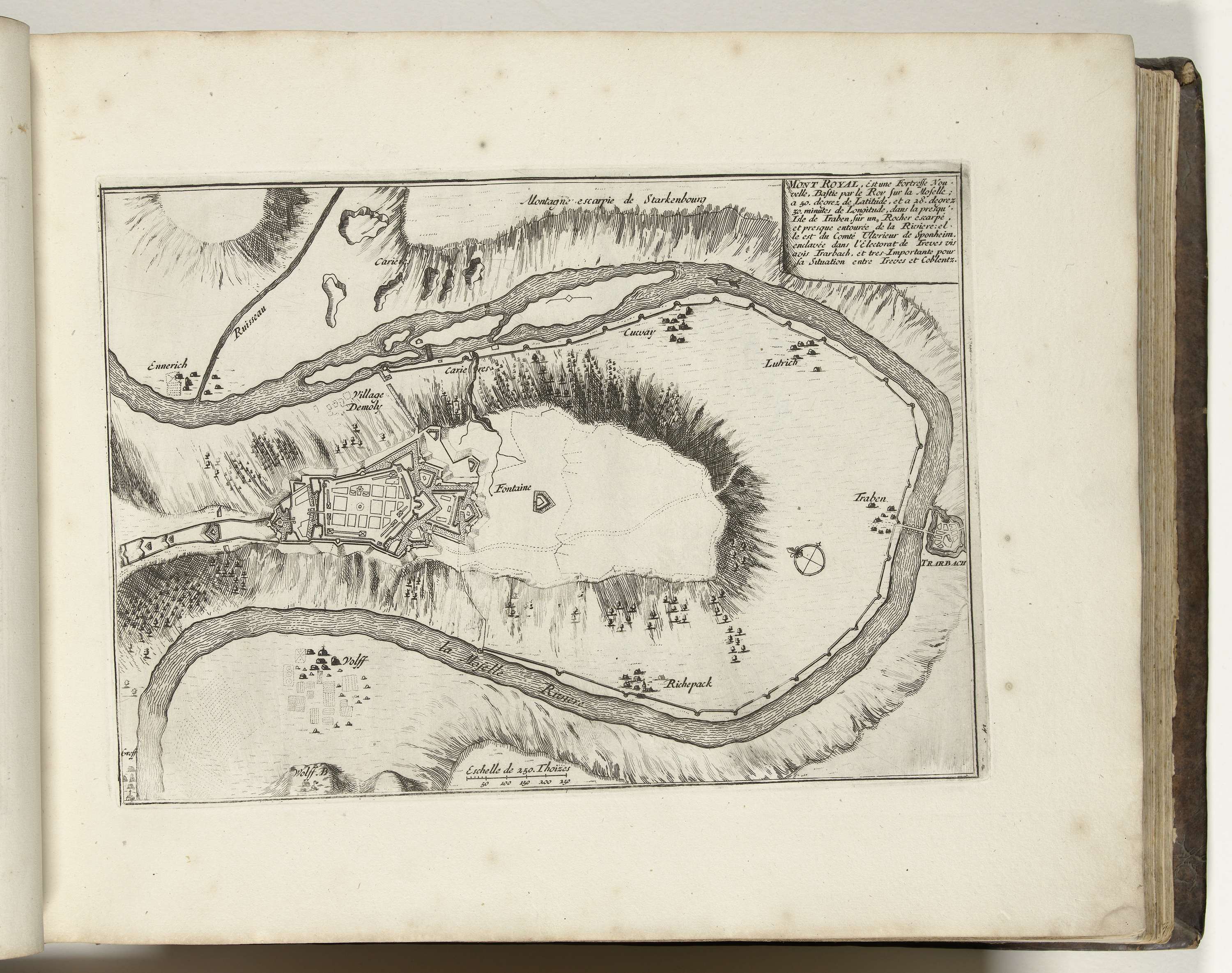 Plattegrond van het fort Mont Royal in een bocht van de Mosel. Onderdeel van het tweede deel (1693) van het prentwerk waarin gebundeld zijn de acht delen van Les forces de l'Europe uitgegeven tussen 1693-1697. Het prentwerk bestaat uit 175 platen met plannen (afkomstig van Sébastien Le Prestre, Seigneur de Vauban) van vermaarde sterke steden ...