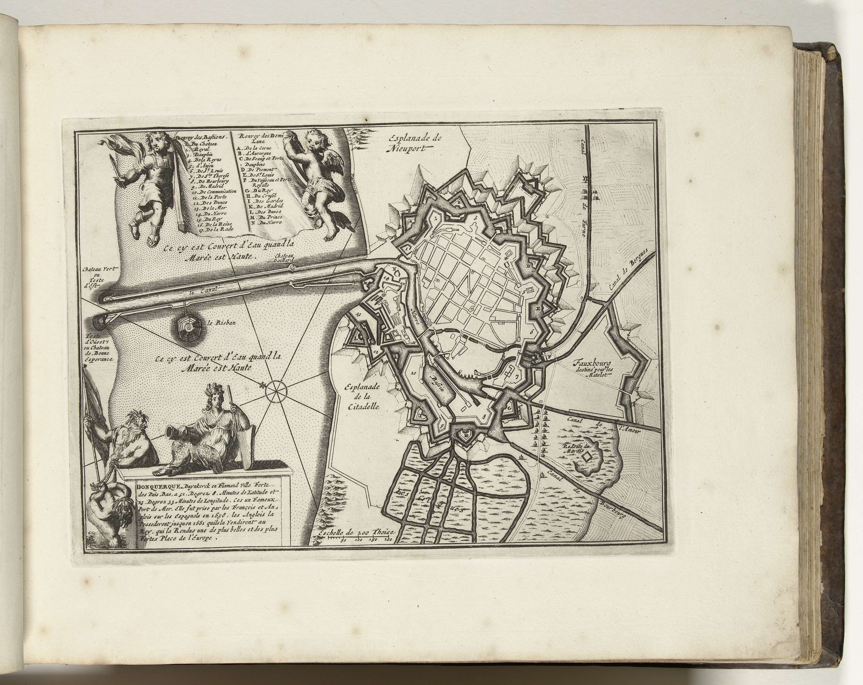 Plattegrond van de versterkingen rond de stad Duinkerke. Onderdeel van het tweede deel (1693) van het prentwerk waarin gebundeld zijn de acht delen van Les forces de l'Europe uitgegeven tussen 1693-1697. Het prentwerk bestaat uit 175 platen met plannen (afkomstig van Sébastien Le Prestre, Seigneur de Vauban) van vermaarde sterke steden en vestingen in de ...