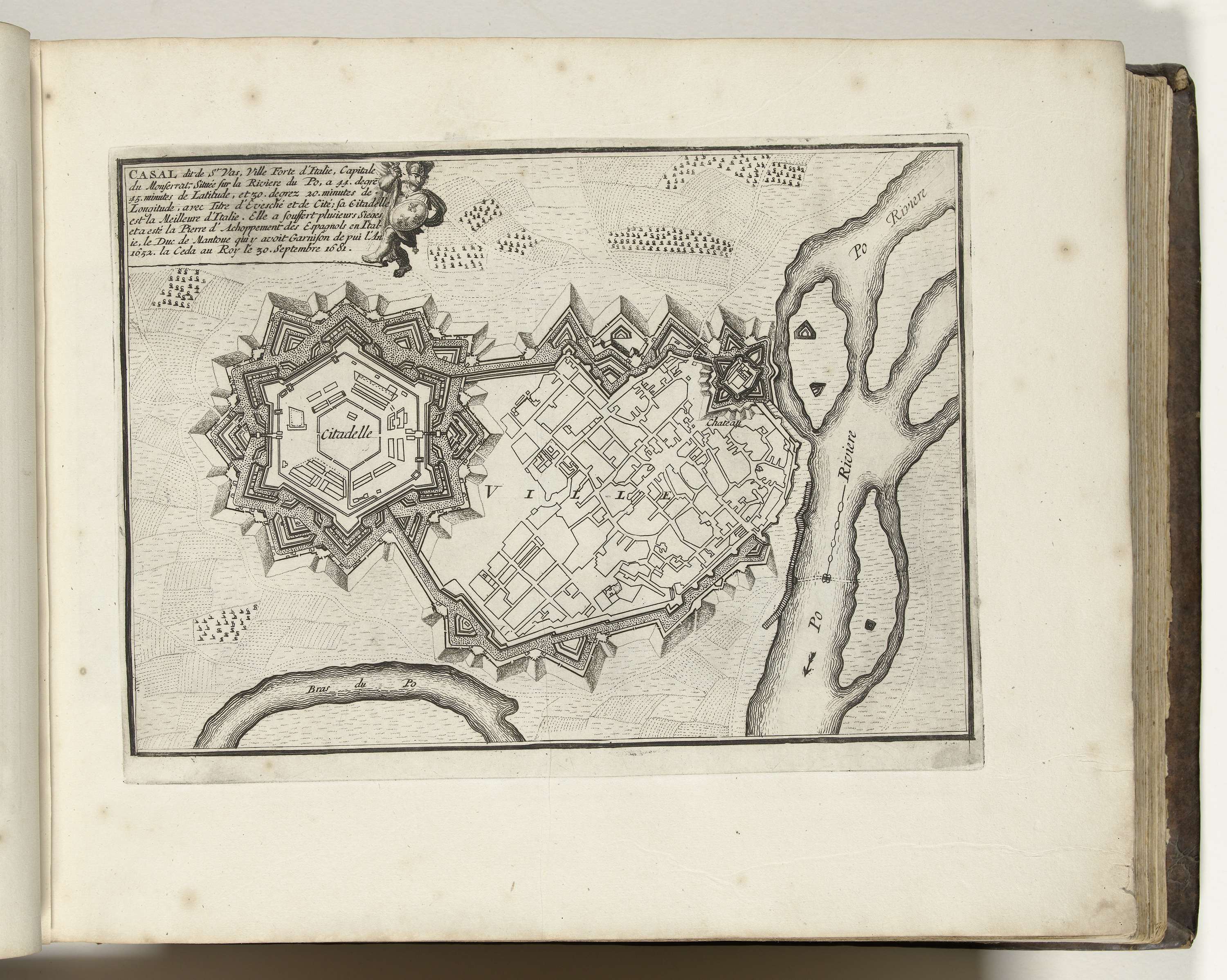 Plattegrond van de versterkingen rond de Italiaanse stad Casale Monferrato. Onderdeel van het tweede deel (1693) van het prentwerk waarin gebundeld zijn de acht delen van Les forces de l'Europe uitgegeven tussen 1693-1697. Het prentwerk bestaat uit 175 platen met plannen (afkomstig van Sébastien Le Prestre, Seigneur de Vauban) van vermaarde sterke steden en vestingen ...