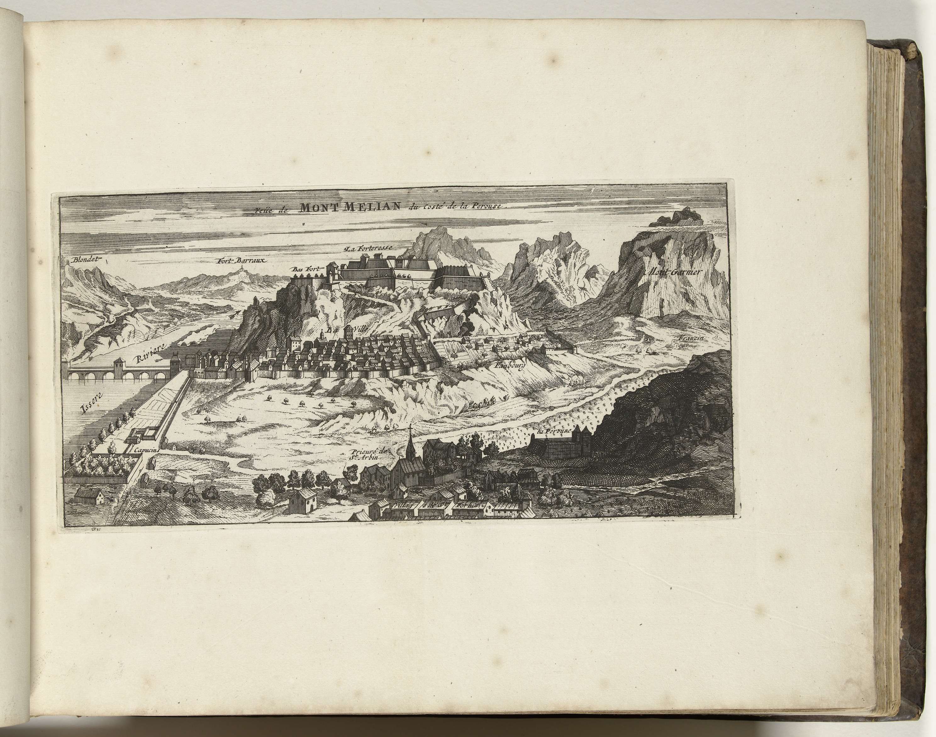 Gezicht op Montmélian met het fort op een heuvel. Onderdeel van het tweede deel (1693) van het prentwerk waarin gebundeld zijn de acht delen van Les forces de l'Europe uitgegeven tussen 1693-1697. Het prentwerk bestaat uit 175 platen met plannen (afkomstig van Sébastien Le Prestre, Seigneur de Vauban) van vermaarde sterke steden en vestingen in ...