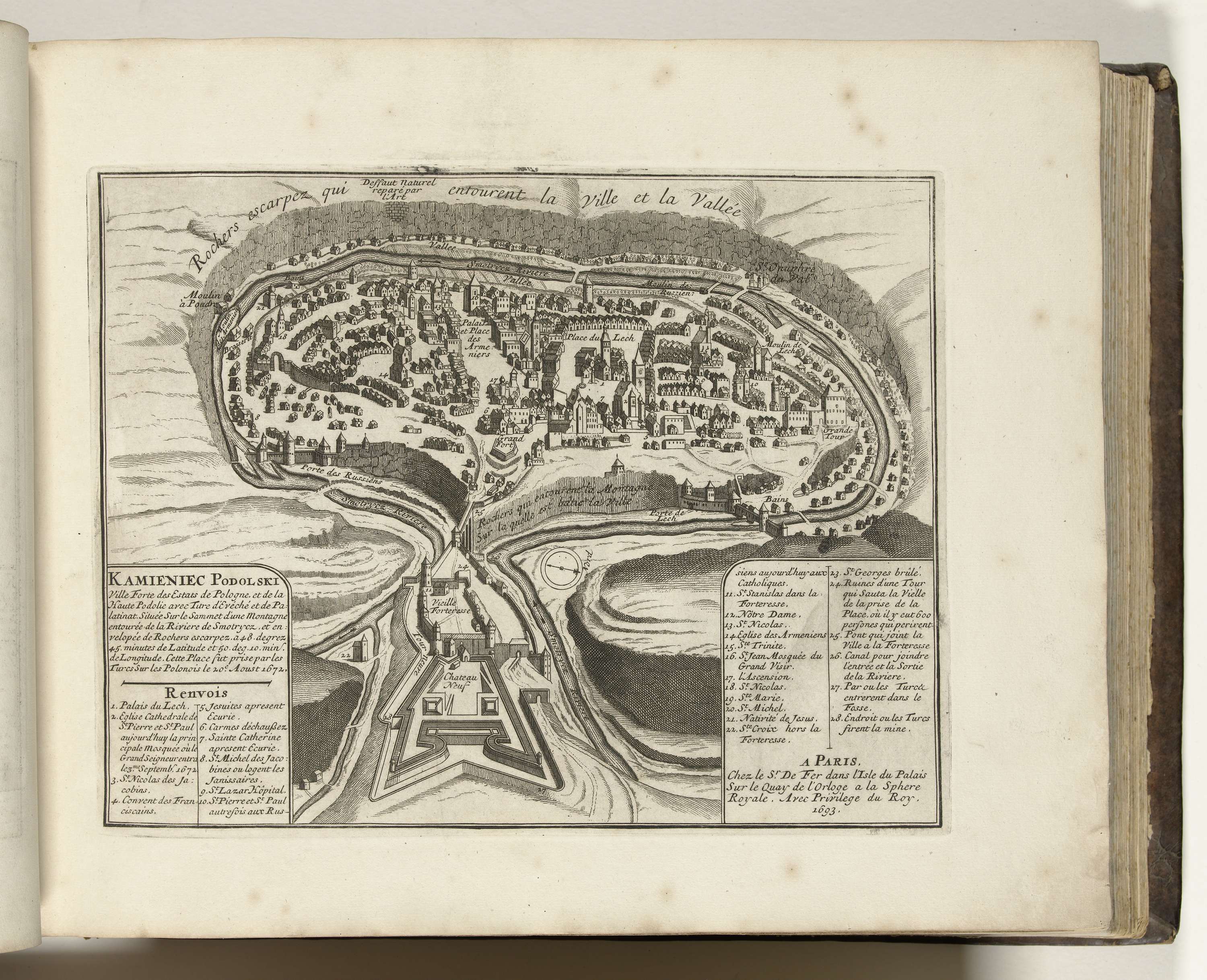 Plattegrond van de stad Kamjanets-Podilsky. Onderdeel van het tweede deel (1693) van het prentwerk waarin gebundeld zijn de acht delen van Les forces de l'Europe uitgegeven tussen 1693-1697. Het prentwerk bestaat uit 175 platen met plannen (afkomstig van Sébastien Le Prestre, Seigneur de Vauban) van vermaarde sterke steden en vestingen in de Negenjarige Oorlog. Titel ...