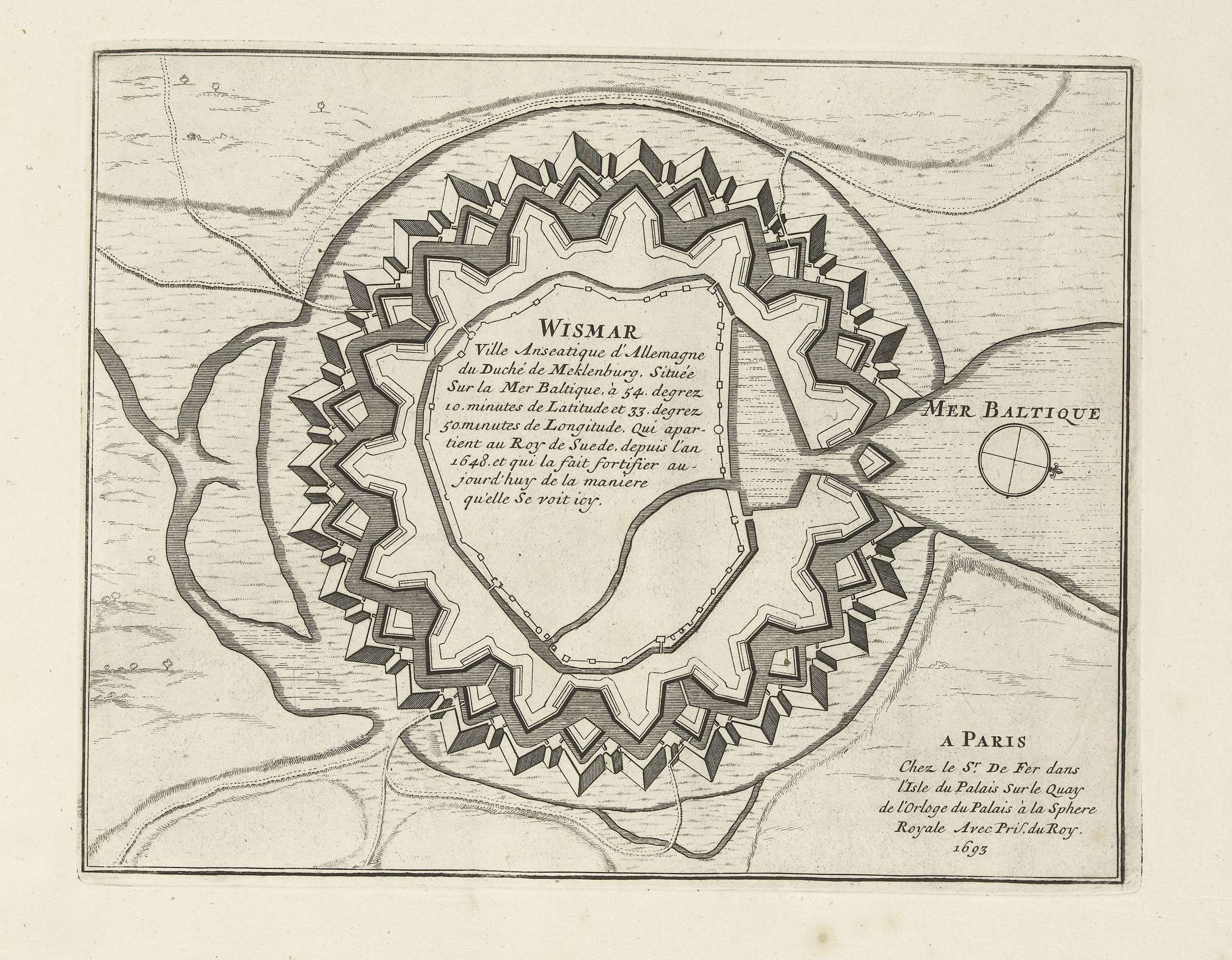 Plattegrond van de versterkingen om de Duitse stad Wismar. Onderdeel van het tweede deel (1693) van het prentwerk waarin gebundeld zijn de acht delen van Les forces de l'Europe uitgegeven tussen 1693-1697. Het prentwerk bestaat uit 175 platen met plannen (afkomstig van Sébastien Le Prestre, Seigneur de Vauban) van vermaarde sterke steden en vestingen in ...