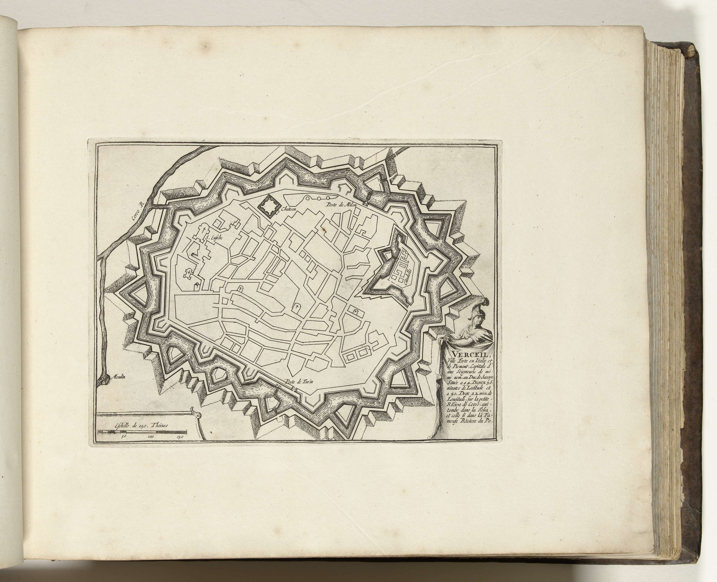 Plattegrond van de versterkingen om de Italiaanse stad Vercelli (Verceil). Onderdeel van het tweede deel (1693) van het prentwerk waarin gebundeld zijn de acht delen van Les forces de l'Europe uitgegeven tussen 1693-1697. Het prentwerk bestaat uit 175 platen met plannen (afkomstig van Sébastien Le Prestre, Seigneur de Vauban) van vermaarde sterke steden en vestingen ...