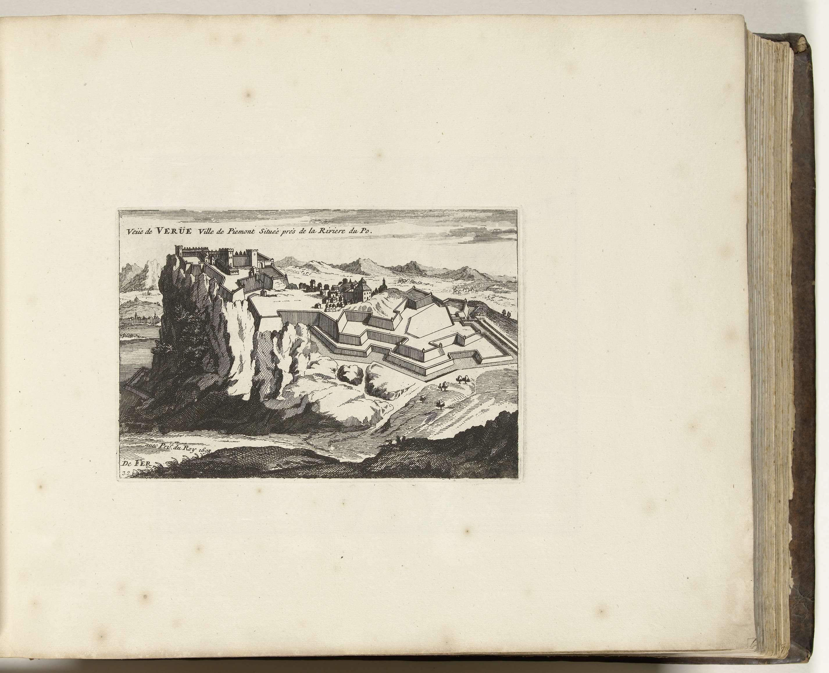 Gezicht op de Italiaanse stad Verua (Verue) aan de Po in Piemonte. Onderdeel van het tweede deel (1693) van het prentwerk waarin gebundeld zijn de acht delen van Les forces de l'Europe uitgegeven tussen 1693-1697. Het prentwerk bestaat uit 175 platen met plannen (afkomstig van Sébastien Le Prestre, Seigneur de Vauban) van vermaarde sterke steden ...