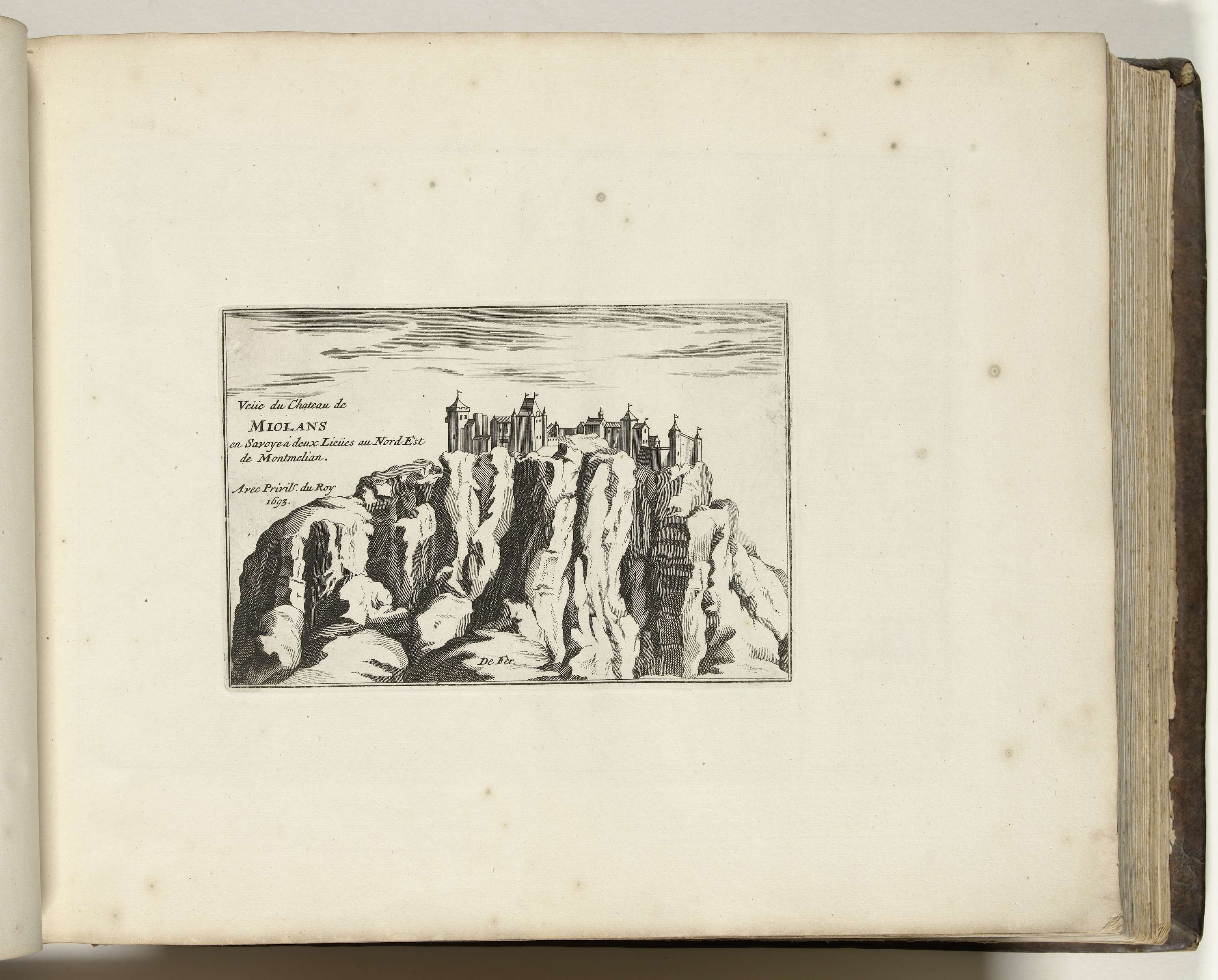 Gezicht op de Franse Château de Miolans, nabij Montmélian. Onderdeel van het tweede deel (1693) van het prentwerk waarin gebundeld zijn de acht delen van Les forces de l'Europe uitgegeven tussen 1693-1697. Het prentwerk bestaat uit 175 platen met plannen (afkomstig van Sébastien Le Prestre, Seigneur de Vauban) van vermaarde sterke steden en vestingen in ...