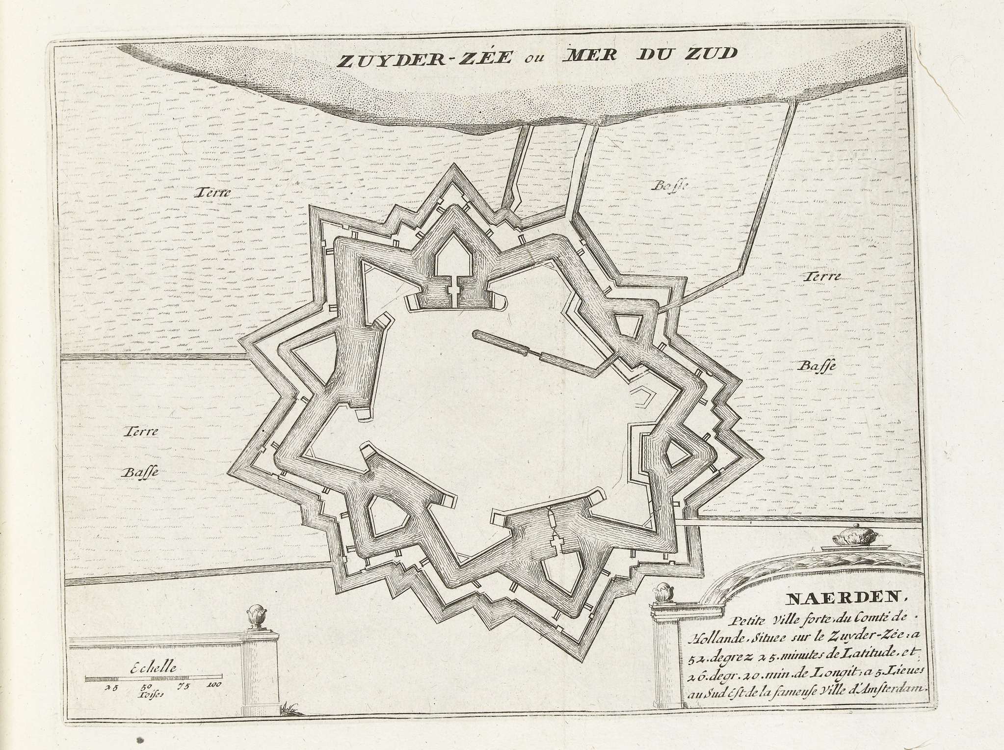 Plattegrond van de versterkingen om de Hollandse stad Naarden. Onderdeel van het derde deel (1695) van het prentwerk waarin gebundeld zijn de acht delen van Les forces de l'Europe uitgegeven tussen 1693-1697. Het prentwerk bestaat uit 175 platen met plannen (afkomstig van Sébastien Le Prestre, Seigneur de Vauban) van vermaarde sterke steden en vestingen in ...