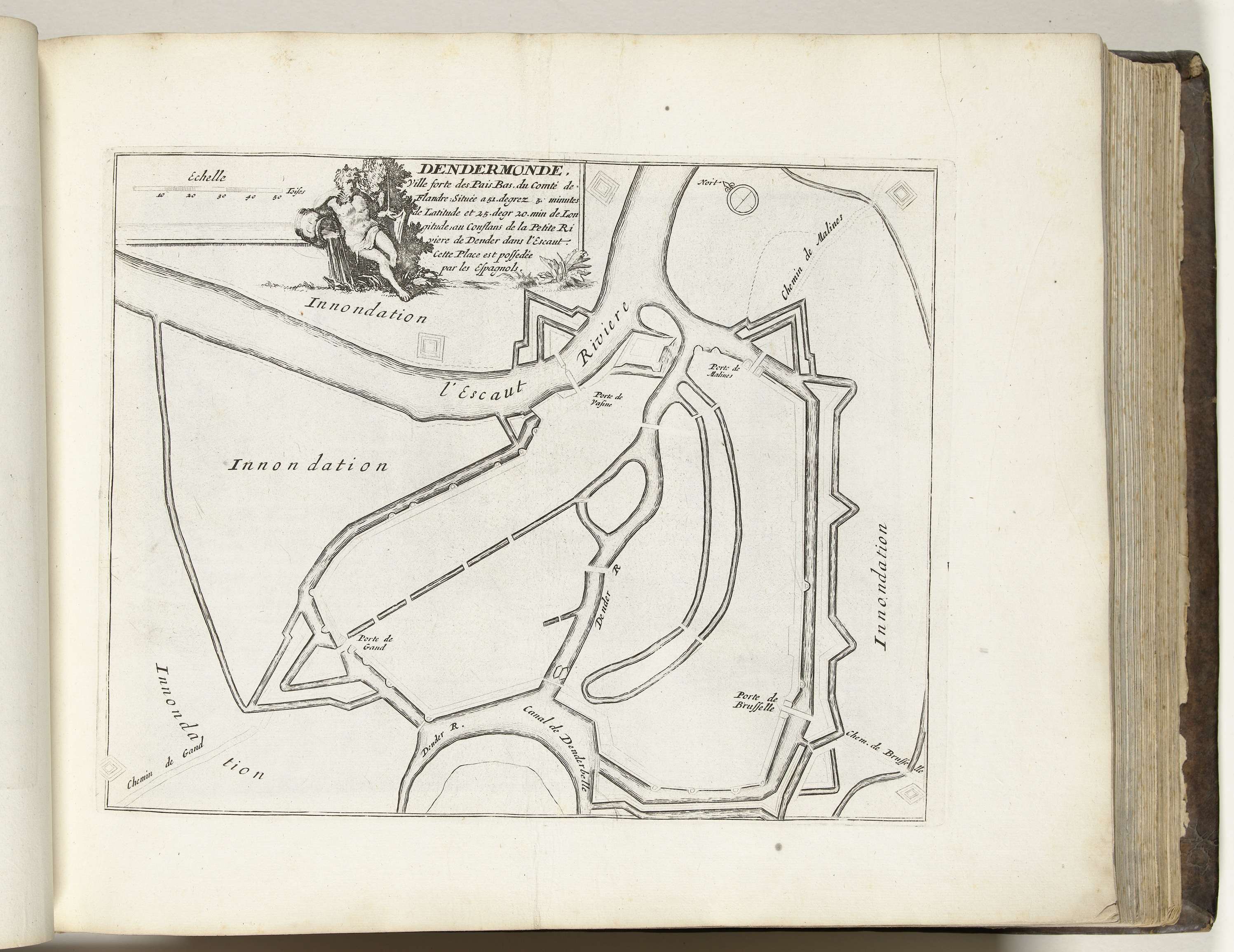 Plattegrond van de versterkingen om de Vlaamse stad Dendermonde. Onderdeel van het derde deel (1695) van het prentwerk waarin gebundeld zijn de acht delen van Les forces de l'Europe uitgegeven tussen 1693-1697. Het prentwerk bestaat uit 175 platen met plannen (afkomstig van Sébastien Le Prestre, Seigneur de Vauban) van vermaarde sterke steden en vestingen in ...