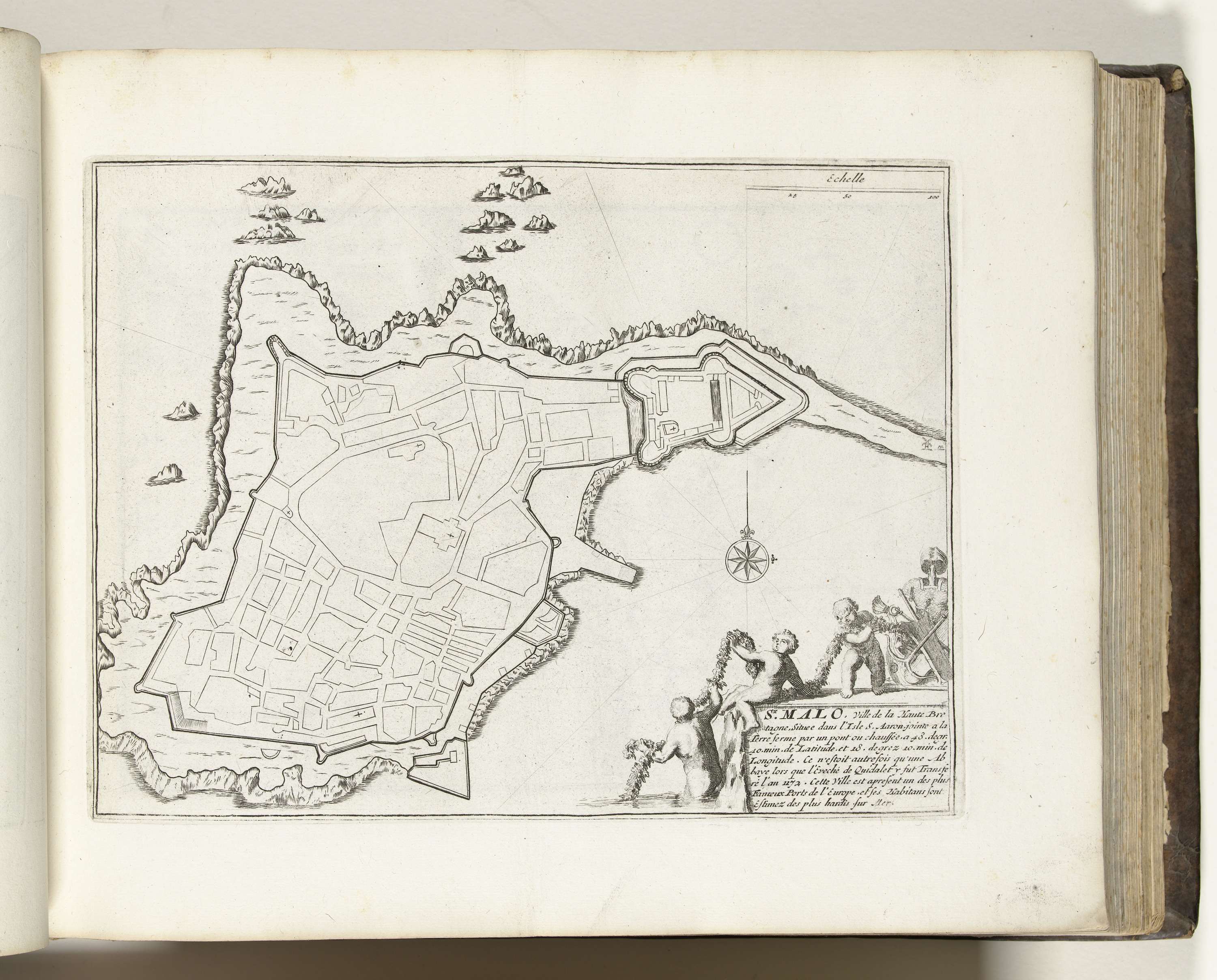 Plattegrond van de versterkingen om de Franse stad Saint-Malo. Onderdeel van het derde deel (1695) van het prentwerk waarin gebundeld zijn de acht delen van Les forces de l'Europe uitgegeven tussen 1693-1697. Het prentwerk bestaat uit 175 platen met plannen (afkomstig van Sébastien Le Prestre, Seigneur de Vauban) van vermaarde sterke steden en vestingen in ...