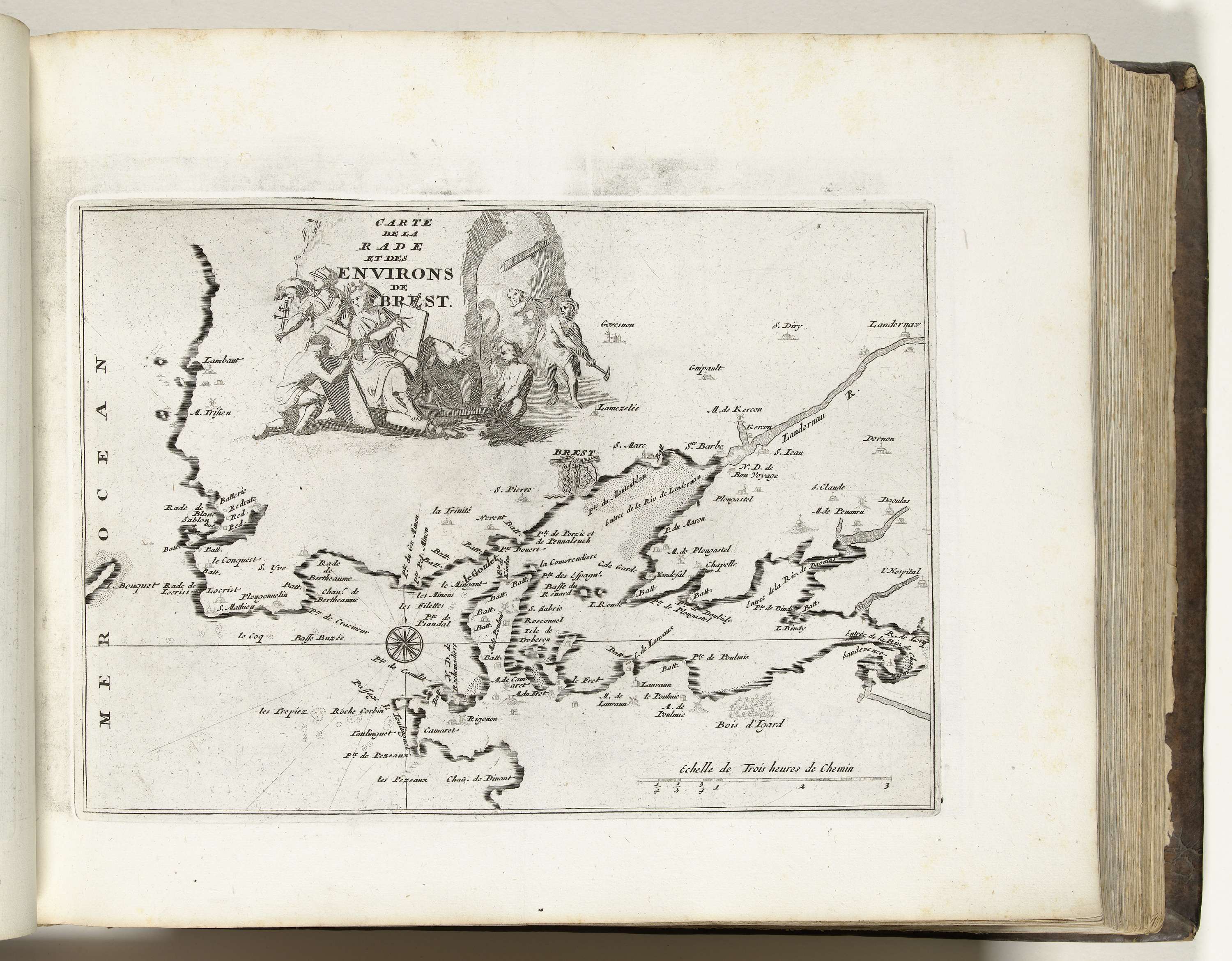 Kaart van de omgeving van de Franse stad Brest. Onderdeel van het derde deel (1695) van het prentwerk waarin gebundeld zijn de acht delen van Les forces de l'Europe uitgegeven tussen 1693-1697. Het prentwerk bestaat uit 175 platen met plannen (afkomstig van Sébastien Le Prestre, Seigneur de Vauban) van vermaarde sterke steden en vestingen in ...