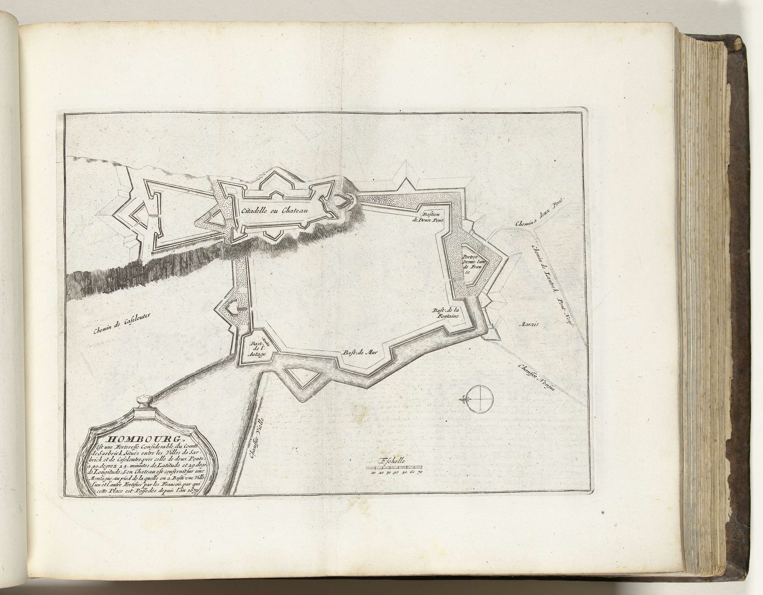 Plattegrond van de versterkingen om de stad Homburg in Saarland. Onderdeel van het derde deel (1695) van het prentwerk waarin gebundeld zijn de acht delen van Les forces de l'Europe uitgegeven tussen 1693-1697. Het prentwerk bestaat uit 175 platen met plannen (afkomstig van Sébastien Le Prestre, Seigneur de Vauban) van vermaarde sterke steden en vestingen ...