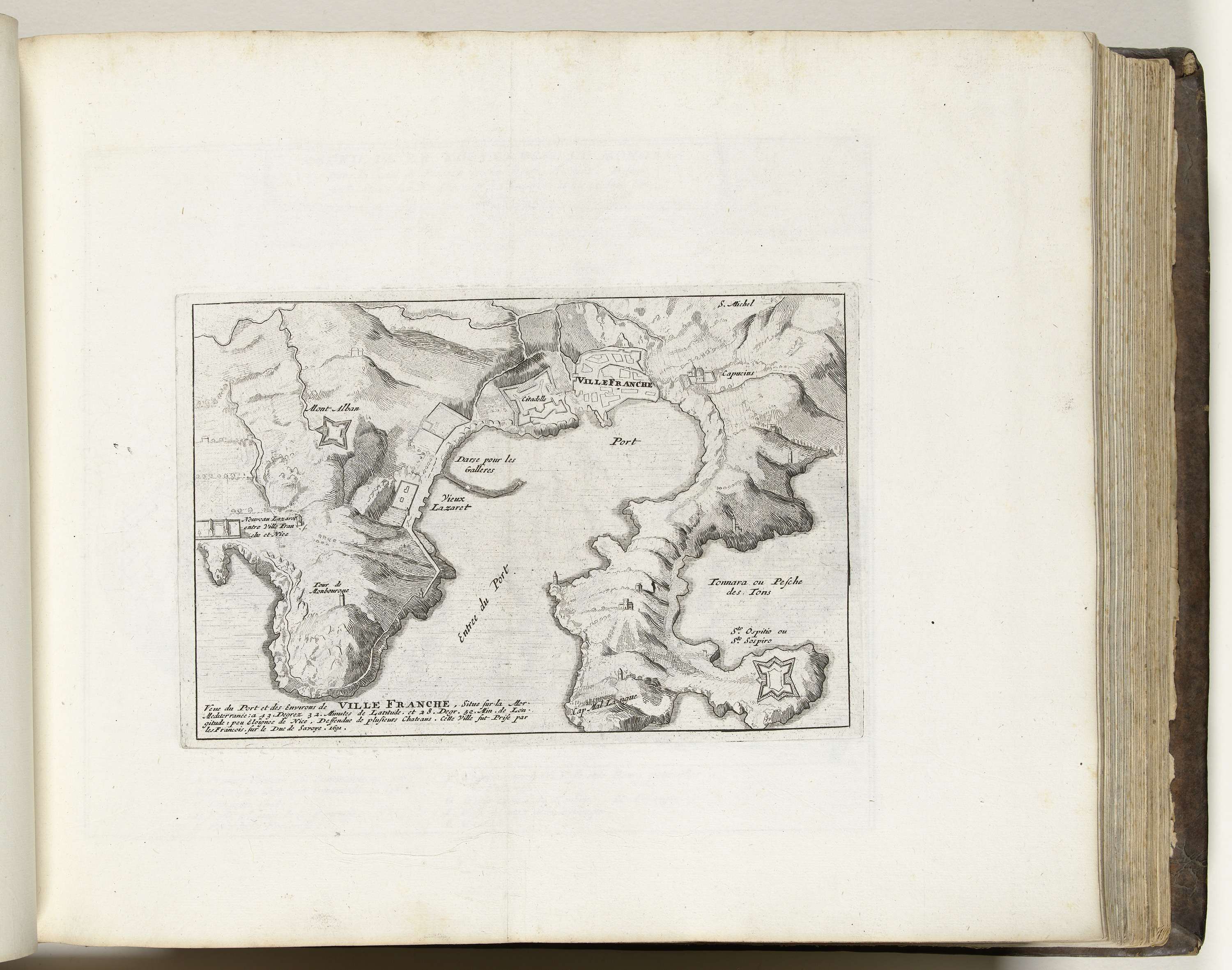 Kaart van de Franse kuststad Villefranche-sur-Mer en omgeving. Onderdeel van het derde deel (1695) van het prentwerk waarin gebundeld zijn de acht delen van Les forces de l'Europe uitgegeven tussen 1693-1697. Het prentwerk bestaat uit 175 platen met plannen (afkomstig van Sébastien Le Prestre, Seigneur de Vauban) van vermaarde sterke steden en vestingen in de ...