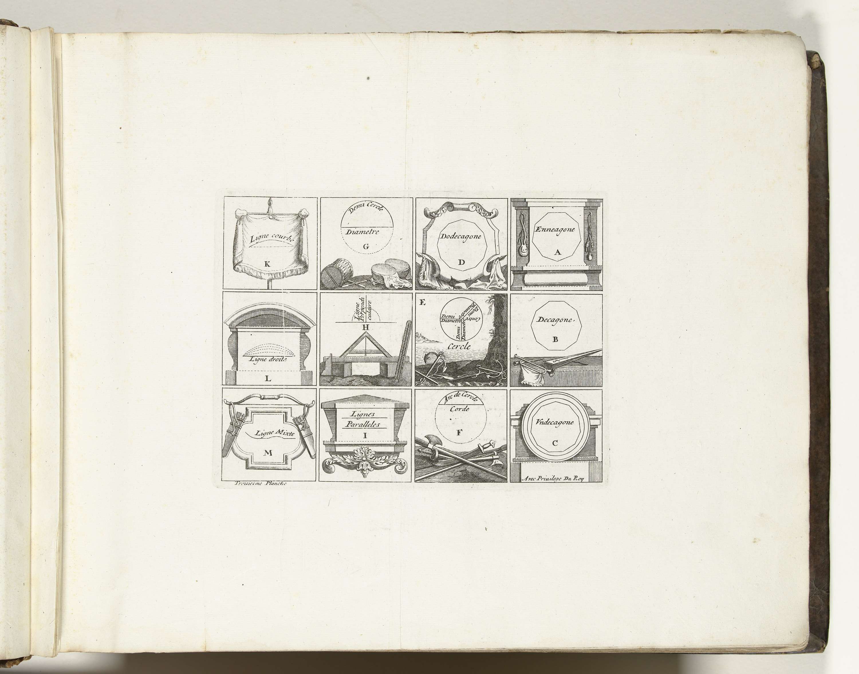 Derde plaat met geometrische figuren toegepast in de vestingbouw. Onderdeel van het eerste deel (1693) van het prentwerk waarin gebundeld zijn de acht delen van Les forces de l'Europe uitgegeven tussen 1693-1697. Het prentwerk bestaat uit 175 platen met plannen (afkomstig van Sébastien Le Prestre, Seigneur de Vauban) van vermaarde sterke steden en vestingen in ...
