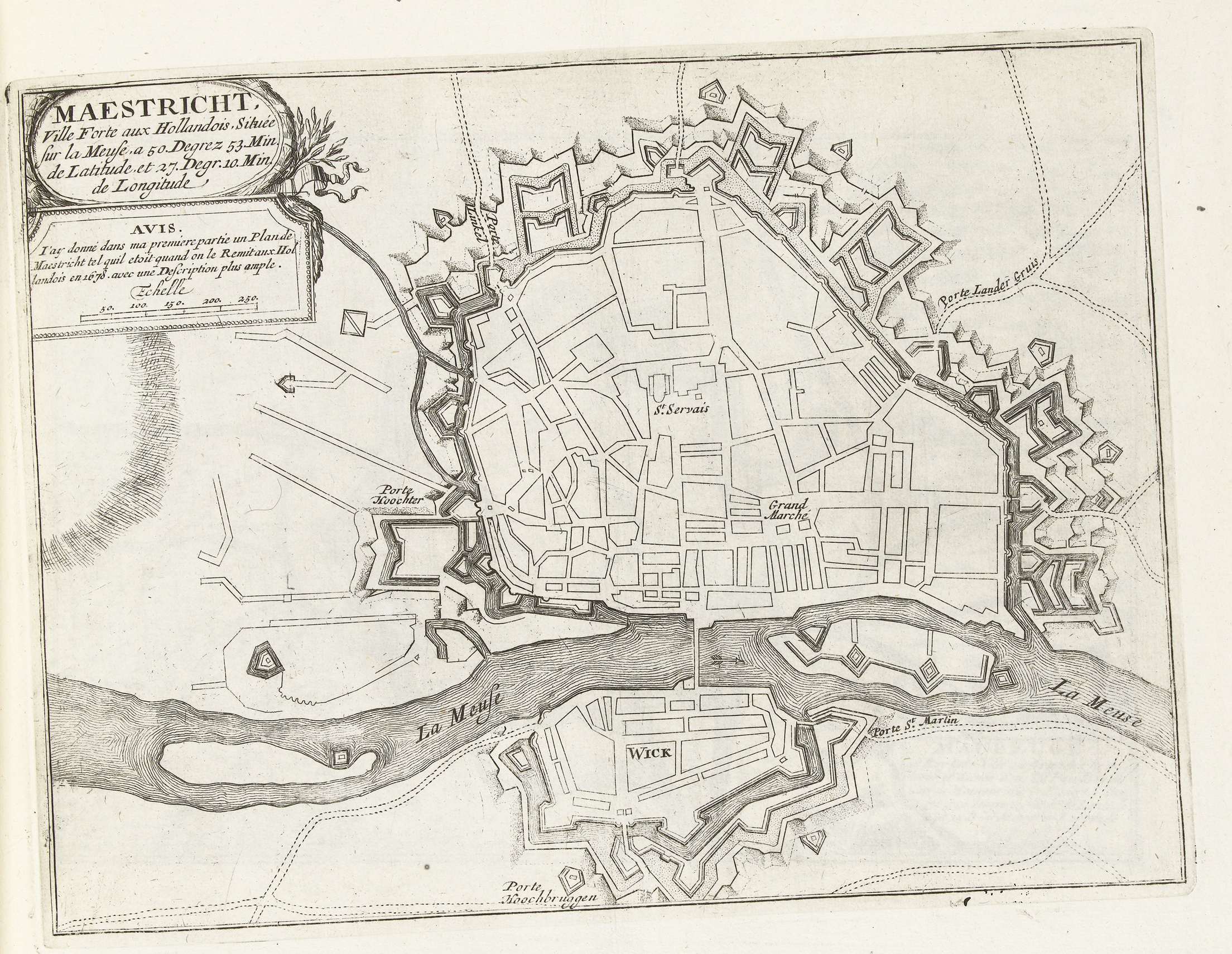 Plattegrond van de versterkingen om de stad Maastricht. Onderdeel van het vierde deel (1697) van het prentwerk waarin gebundeld zijn de acht delen van Les forces de l'Europe uitgegeven tussen 1693-1697. Het prentwerk bestaat uit 175 platen met plannen (afkomstig van Sébastien Le Prestre, Seigneur de Vauban) van vermaarde sterke steden en vestingen in de ...