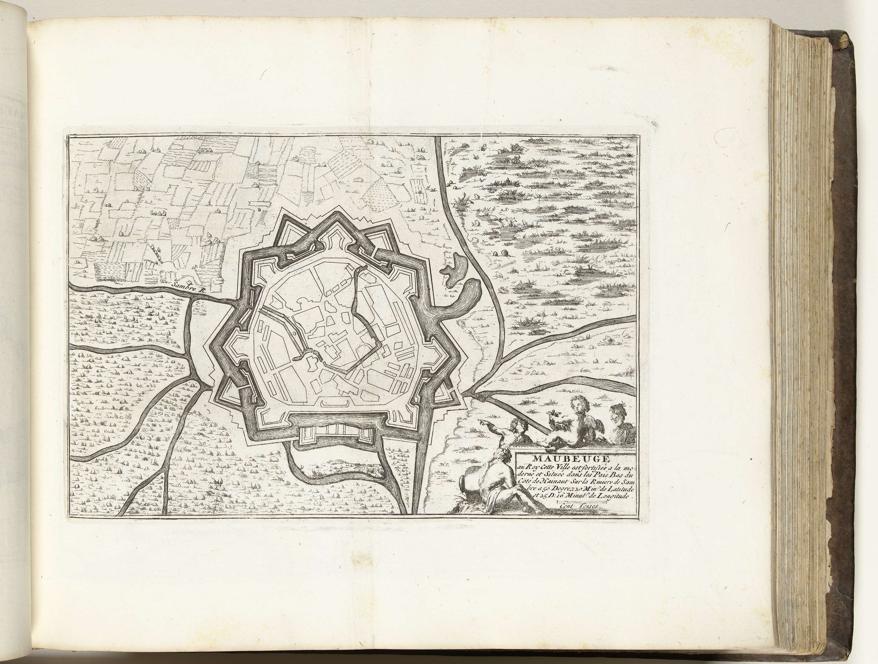 Plattegrond van de versterkingen om de Franse stad Maubeuge. Onderdeel van het vierde deel (1697) van het prentwerk waarin gebundeld zijn de acht delen van Les forces de l'Europe uitgegeven tussen 1693-1697. Het prentwerk bestaat uit 175 platen met plannen (afkomstig van Sébastien Le Prestre, Seigneur de Vauban) van vermaarde sterke steden en vestingen in ...