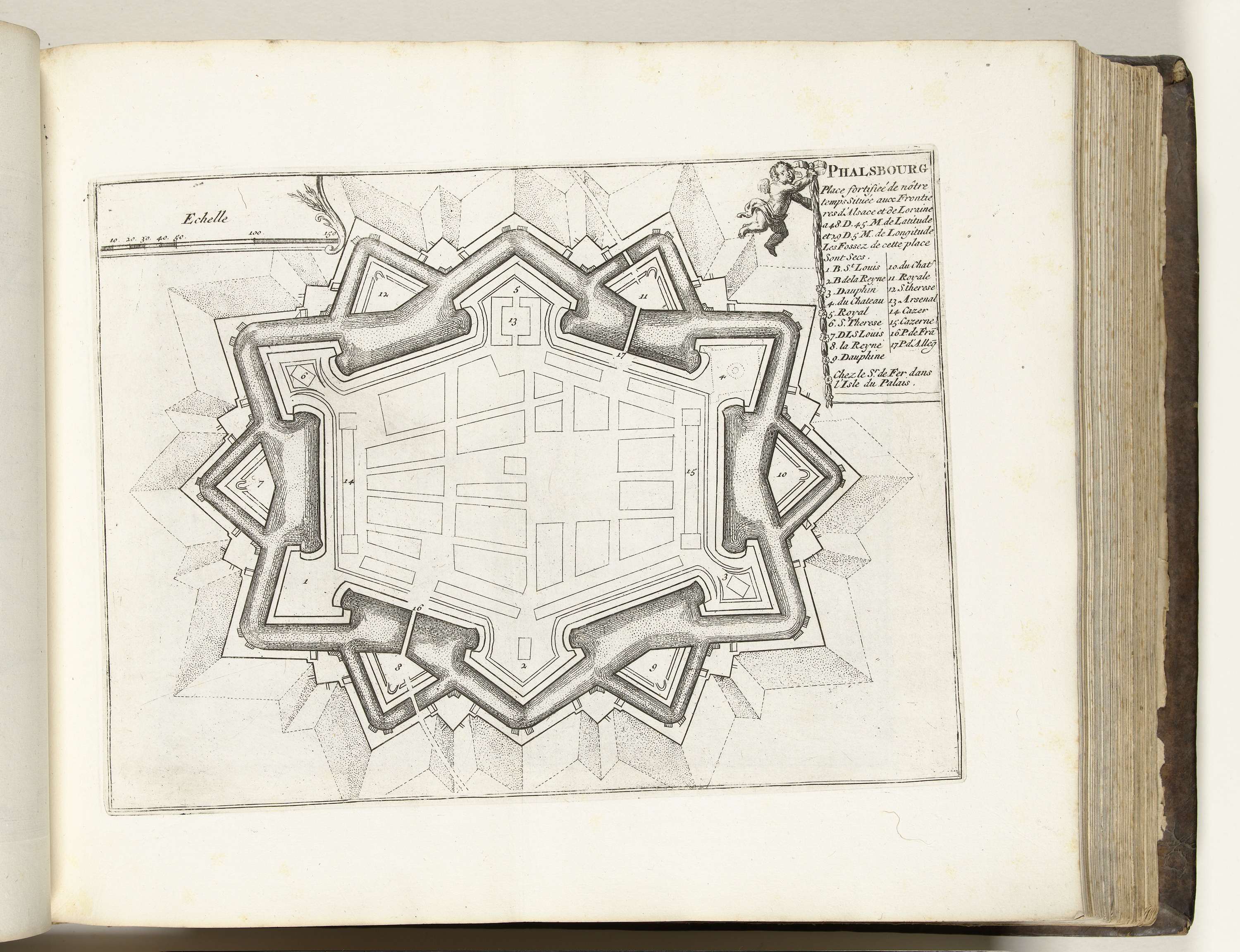 Plattegrond van de versterkingen om de Franse stad Phalsbourg. Onderdeel van het vierde deel (1697) van het prentwerk waarin gebundeld zijn de acht delen van Les forces de l'Europe uitgegeven tussen 1693-1697. Het prentwerk bestaat uit 175 platen met plannen (afkomstig van Sébastien Le Prestre, Seigneur de Vauban) van vermaarde sterke steden en vestingen in ...