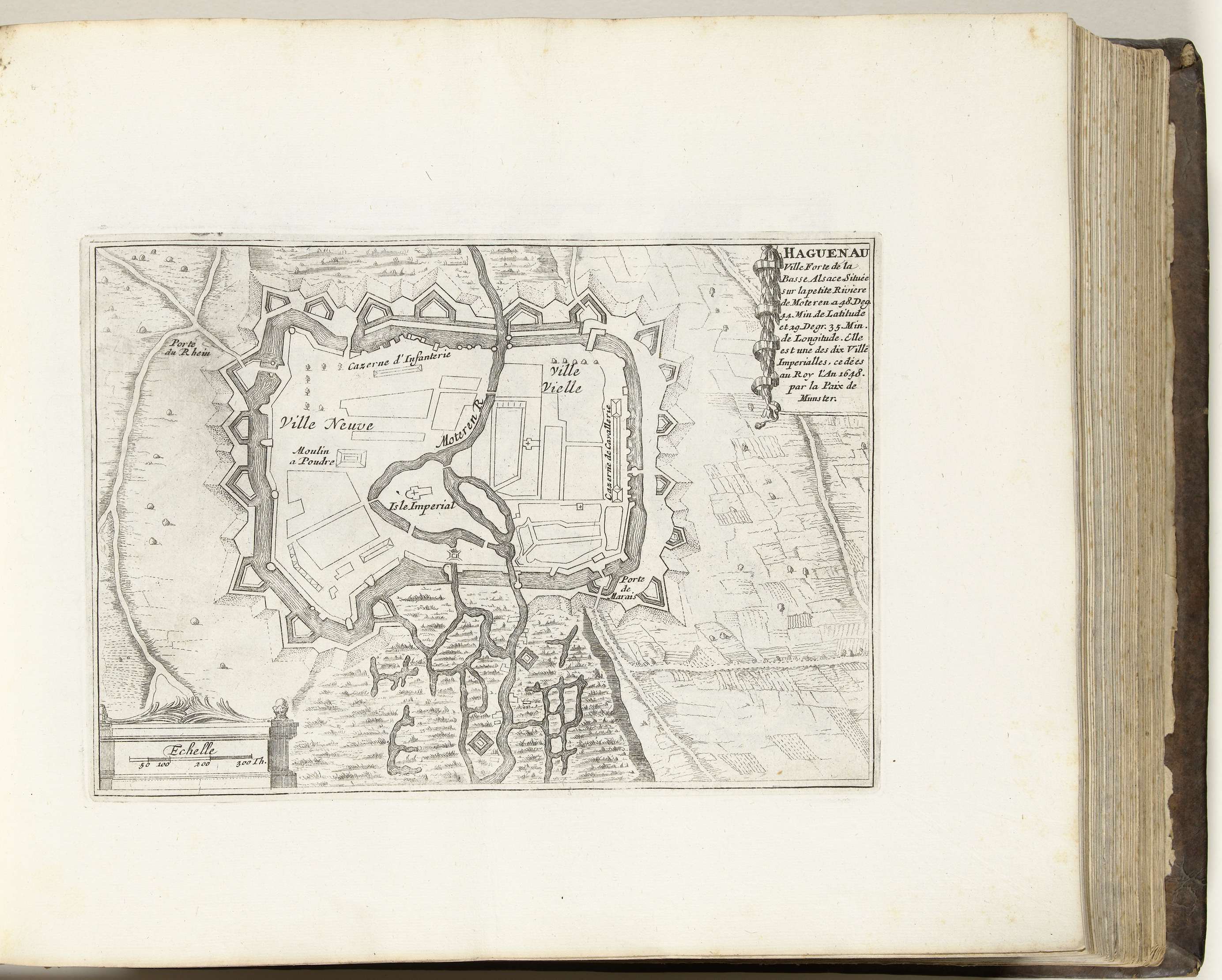 Plattegrond van de versterkingen om de Franse stad Haguenau. Onderdeel van het vierde deel (1697) van het prentwerk waarin gebundeld zijn de acht delen van Les forces de l'Europe uitgegeven tussen 1693-1697. Het prentwerk bestaat uit 175 platen met plannen (afkomstig van Sébastien Le Prestre, Seigneur de Vauban) van vermaarde sterke steden en vestingen in ...