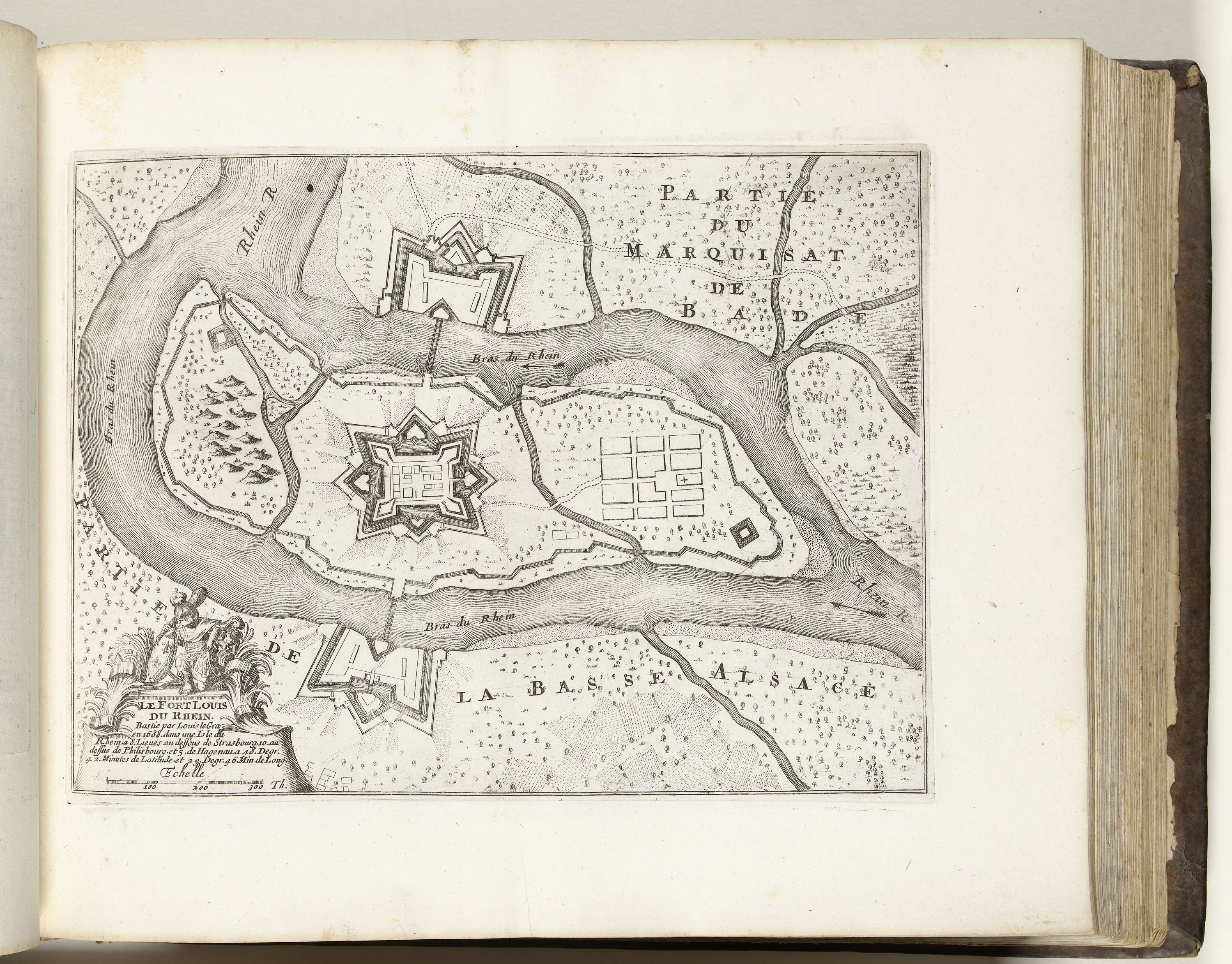 Plattegrond van het in 1688 door de Fransen gebouwde Fort Louis, gelegen aan de Rijn onder Straatsburg. Onderdeel van het vierde deel (1697) van het prentwerk waarin gebundeld zijn de acht delen van Les forces de l'Europe uitgegeven tussen 1693-1697. Het prentwerk bestaat uit 175 platen met plannen (afkomstig van Sébastien Le Prestre, Seigneur de ...