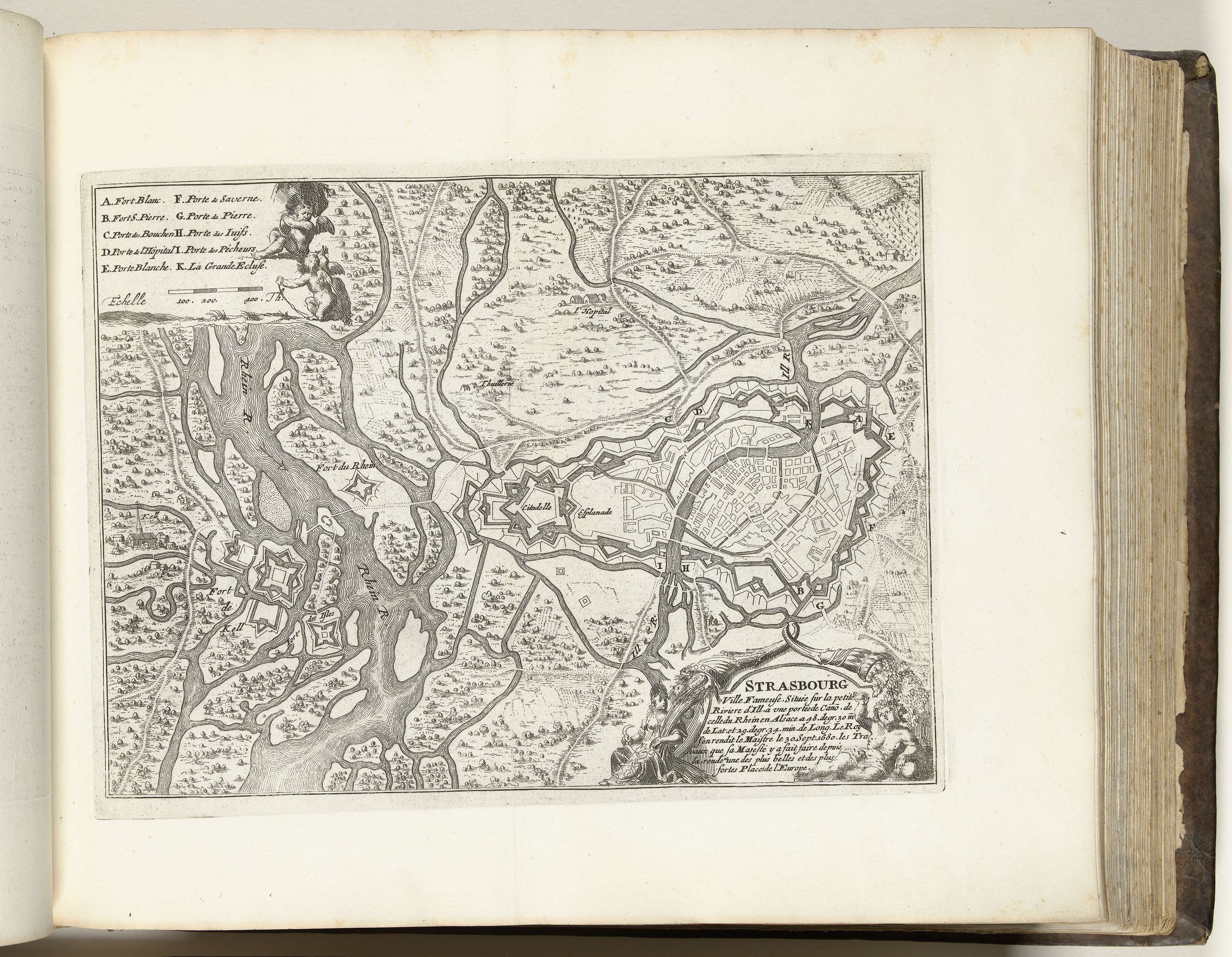 Plattegrond van de versterkingen om en nabij de Franse stad Straatsburg. Onderdeel van het vierde deel (1697) van het prentwerk waarin gebundeld zijn de acht delen van Les forces de l'Europe uitgegeven tussen 1693-1697. Het prentwerk bestaat uit 175 platen met plannen (afkomstig van Sébastien Le Prestre, Seigneur de Vauban) van vermaarde sterke steden en ...