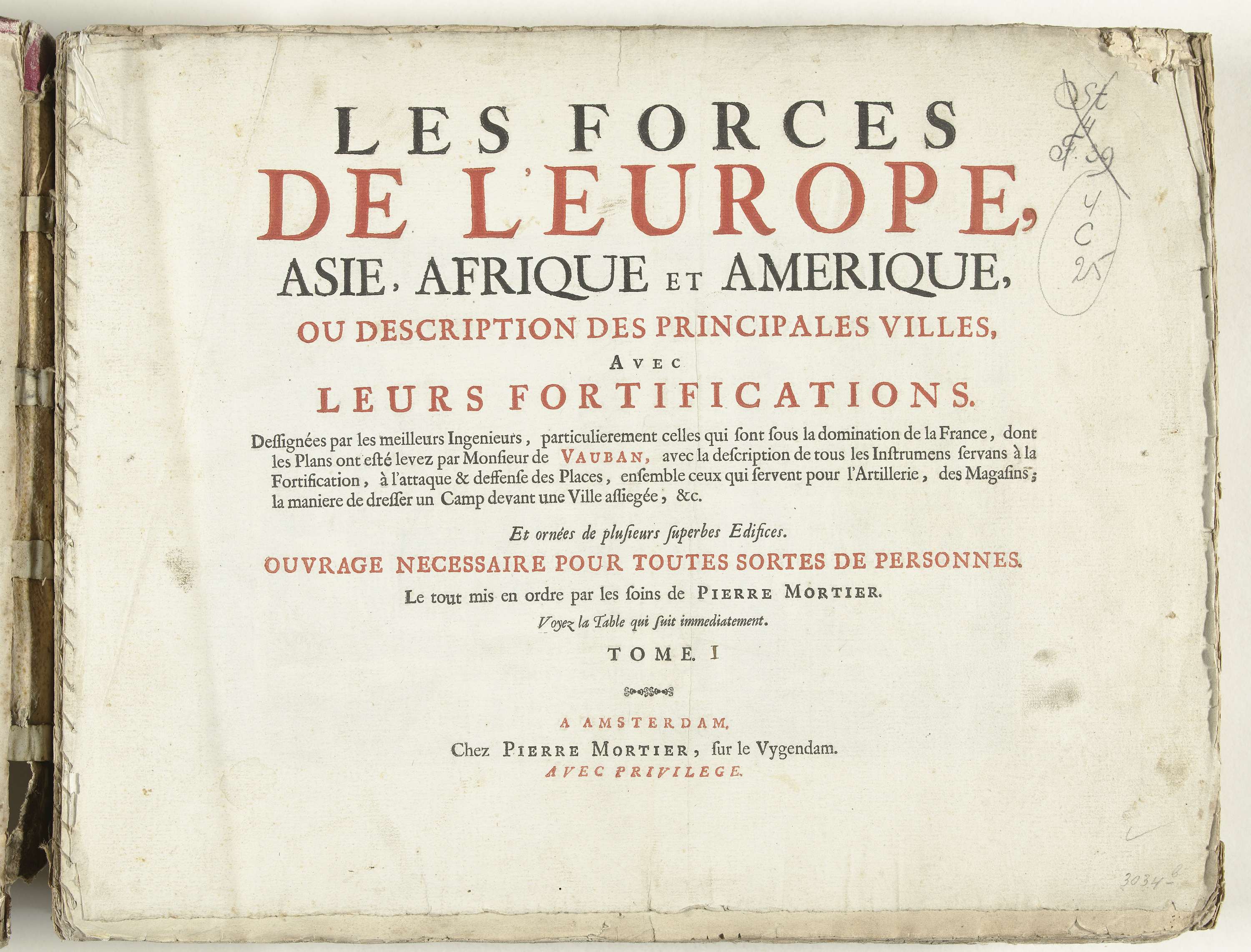 Titelpagina gedrukt in zwart en rood voor het eerste van twaalf delen van het prentwerk: Les Forces de l'Europe, Asie, Afrique et Amerique, uitgegeven ca. 1702. Het prentwerk bestaat in totaal uit 276 genummerde platen van vermaarde sterke steden en vestingen in het kader van de Spaanse Successieoorlog. Voor het merendeel zijn deze platen gekopieerd ...