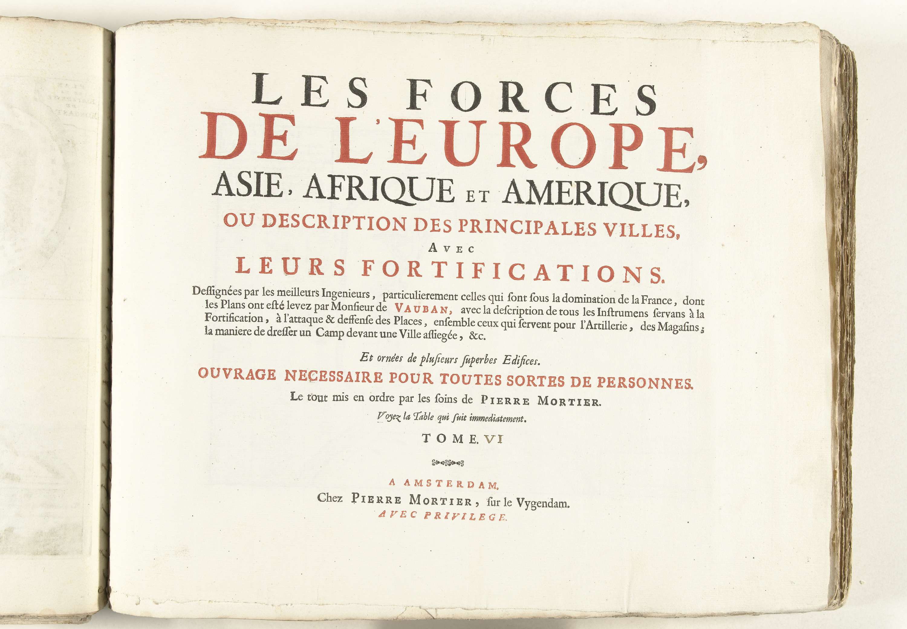 Titelpagina gedrukt in zwart en rood voor het zesde van twaalf delen van het prentwerk: Les Forces de l'Europe, Asie, Afrique et Amerique, uitgegeven ca. 1702. Ongenummerd [114]. Het prentwerk bestaat in totaal uit 276 genummerde platen van vermaarde sterke steden en vestingen in het kader van de Spaanse Successieoorlog. Voor het merendeel zijn deze ...