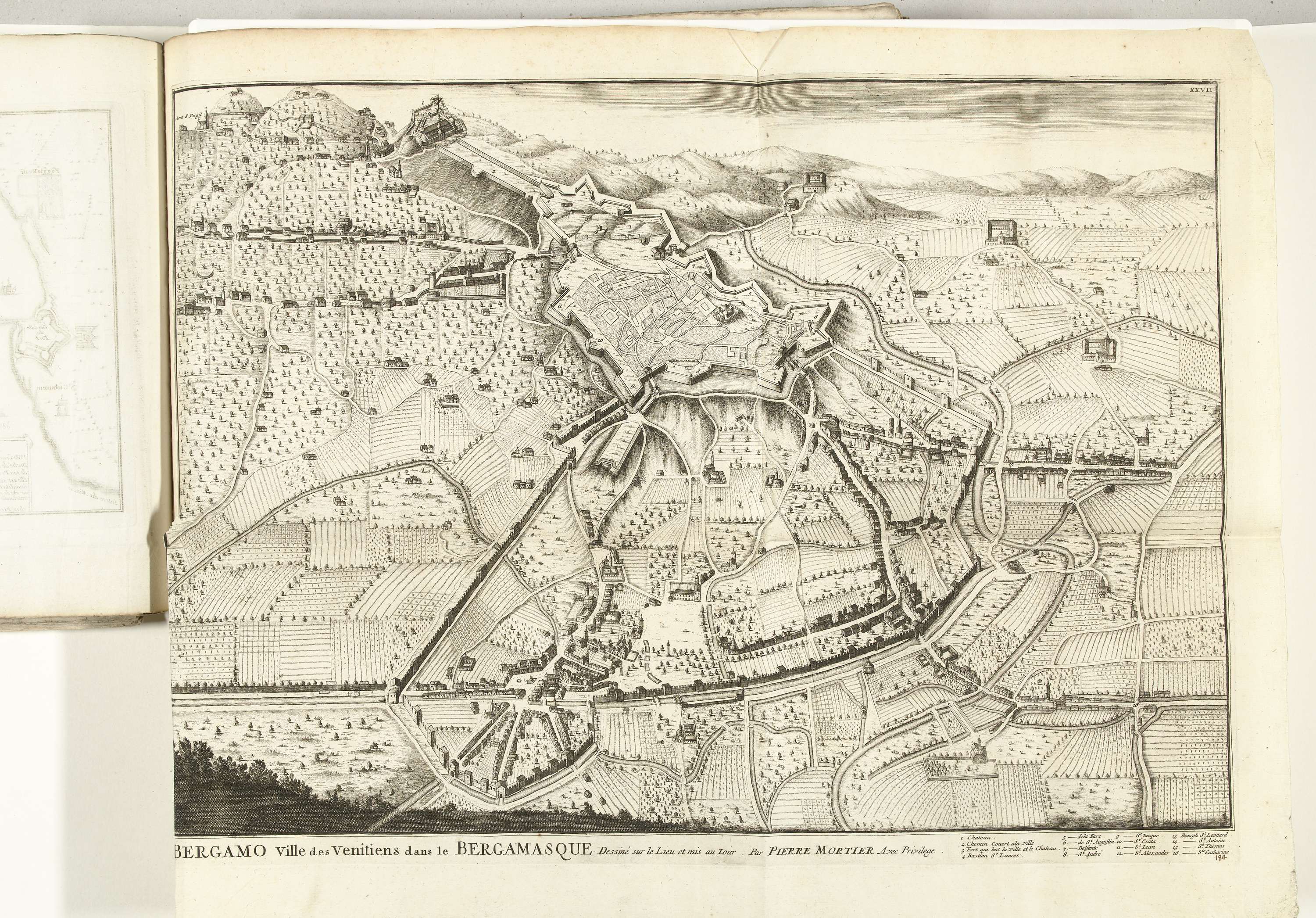 Grote plattegrond van de Italiaanse stad Bergamo. Gemerkt rechtsboven: XXVII. Plaat nr. 184 in het prentwerk bestaande in totaal uit 276 genummerde platen van vermaarde sterke steden en vestingen in het kader van de Spaanse Successieoorlog. Voor het merendeel zijn deze platen gekopieerd naar de anonieme Franse platen: in Les forces de l'Europe en in: ...