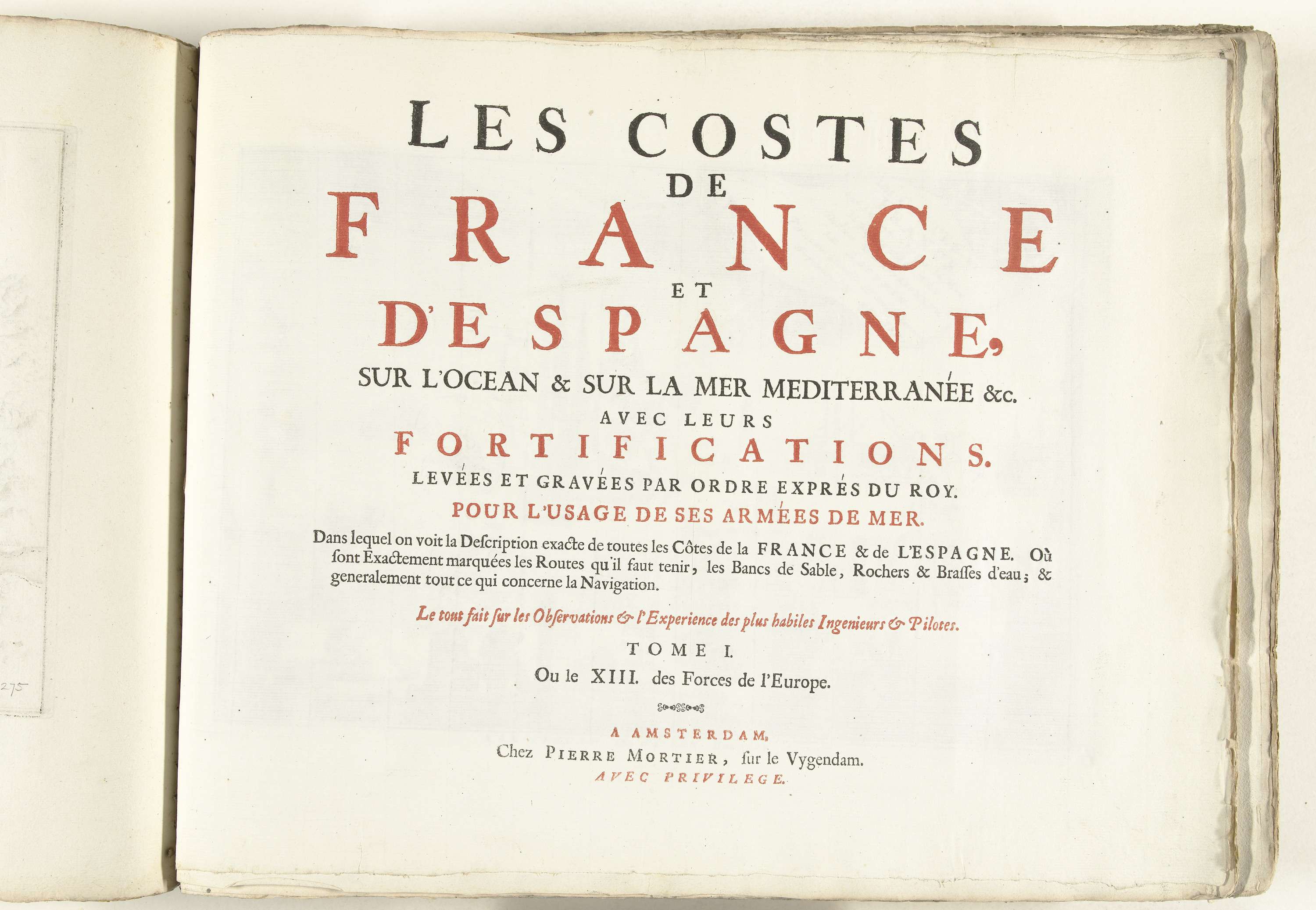 Titelpagina gedrukt in zwart en rood voor het eerste van twee delen van het prentwerk: Les costes de France et d'Espagne, oftewel deel 13 van: Les Forces de l'Europe, Asie, Afrique et Amerique, uitgegeven ca. 1702. Het prentwerk bestaat in totaal uit 43 gemerkte platen van de kust van Frankrijk en Spanje, in het kader ...