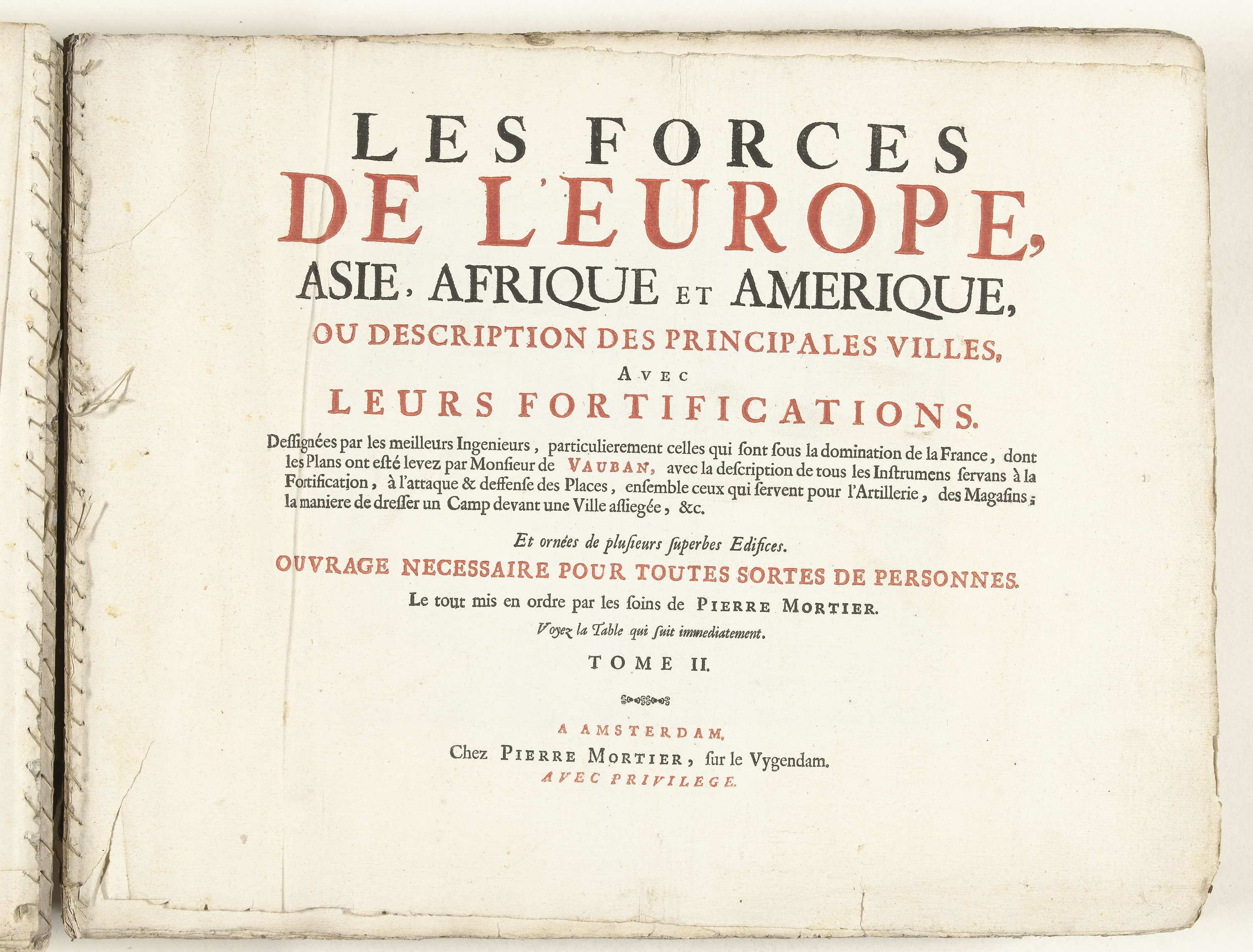 Titelpagina gedrukt in zwart en rood voor het tweede van twaalf delen van het prentwerk: Les Forces de l'Europe, Asie, Afrique et Amerique, uitgegeven ca. 1702. Ongenummerd [25]. Het prentwerk bestaat in totaal uit 276 genummerde platen van vermaarde sterke steden en vestingen in het kader van de Spaanse Successieoorlog. Voor het merendeel zijn deze ...