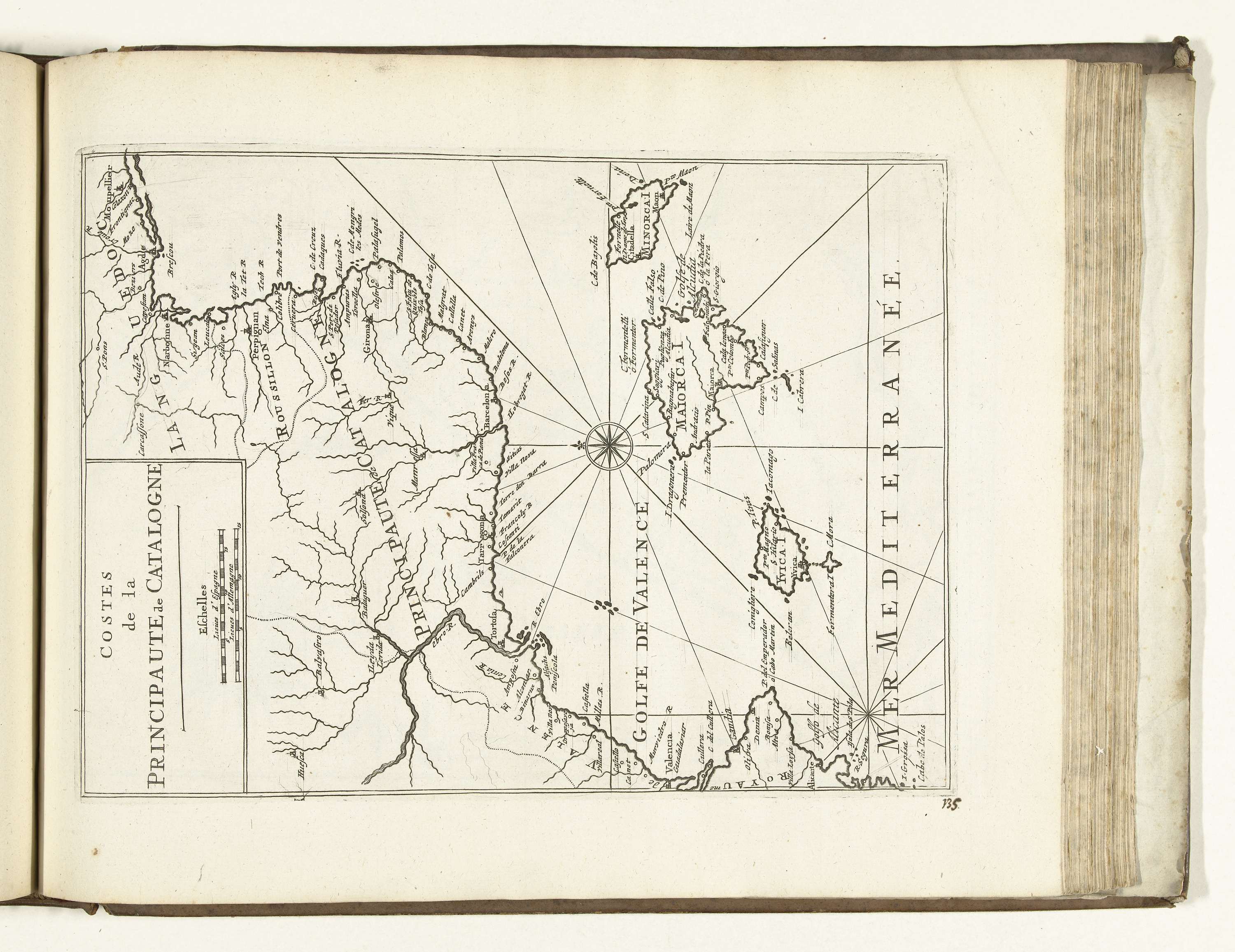Kaart van de Catalaanse kust met de Balearen. Plaat nr. 135 in deel VI van het prentwerk: Les Forces de l'Europe, Asie, Afrique et Amerique ... Comme aussi les Cartes des Côtes de France et d'Espagne uit 1726, dit eerste deel met 238 met de hand genummerde platen van vermaarde sterke steden en vestingen in ...