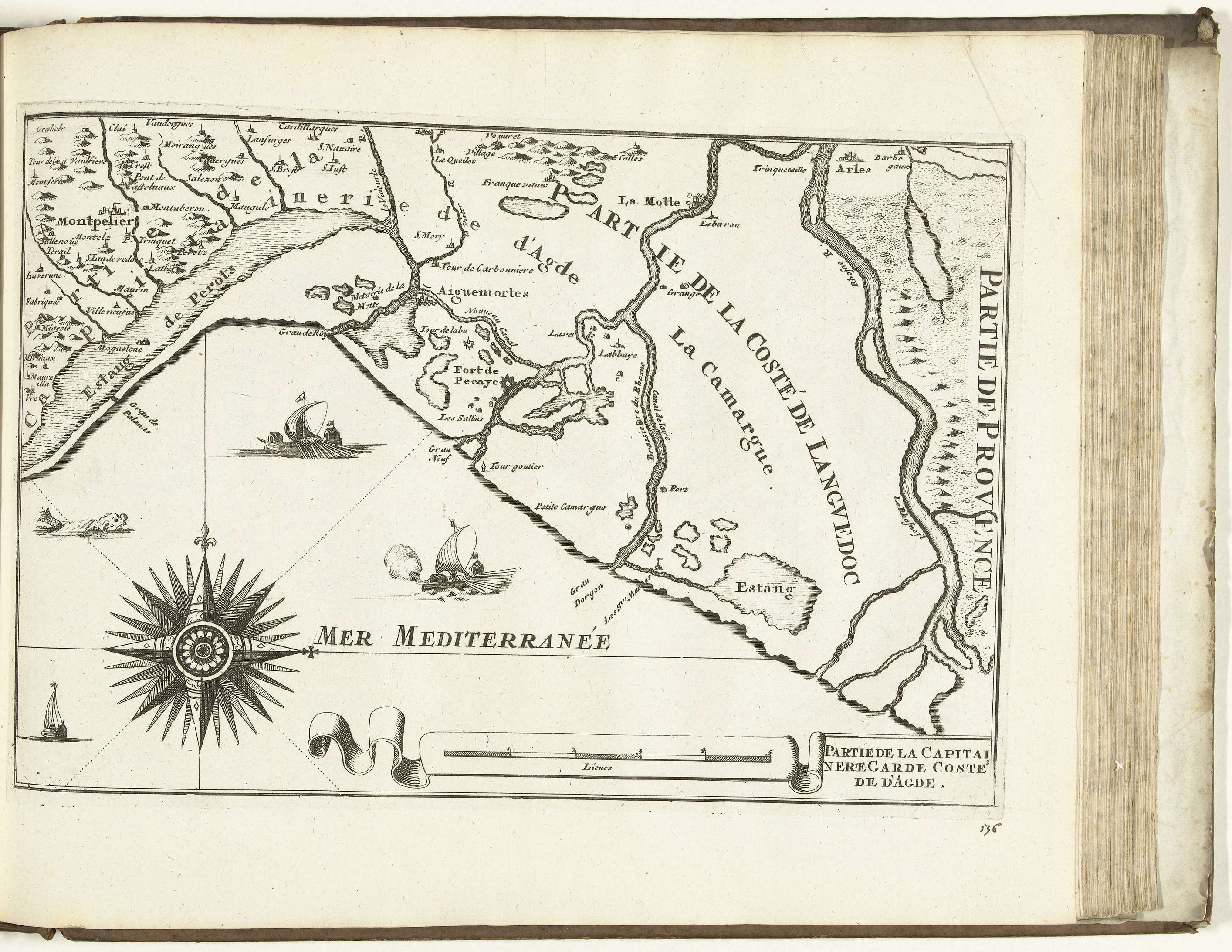 Kaart van de Franse zuidkust bij Montpellier. Plaat nr. 136 in deel VI van het prentwerk: Les Forces de l'Europe, Asie, Afrique et Amerique ... Comme aussi les Cartes des Côtes de France et d'Espagne uit 1726, dit eerste deel met 238 met de hand genummerde platen van vermaarde sterke steden en vestingen in het ...