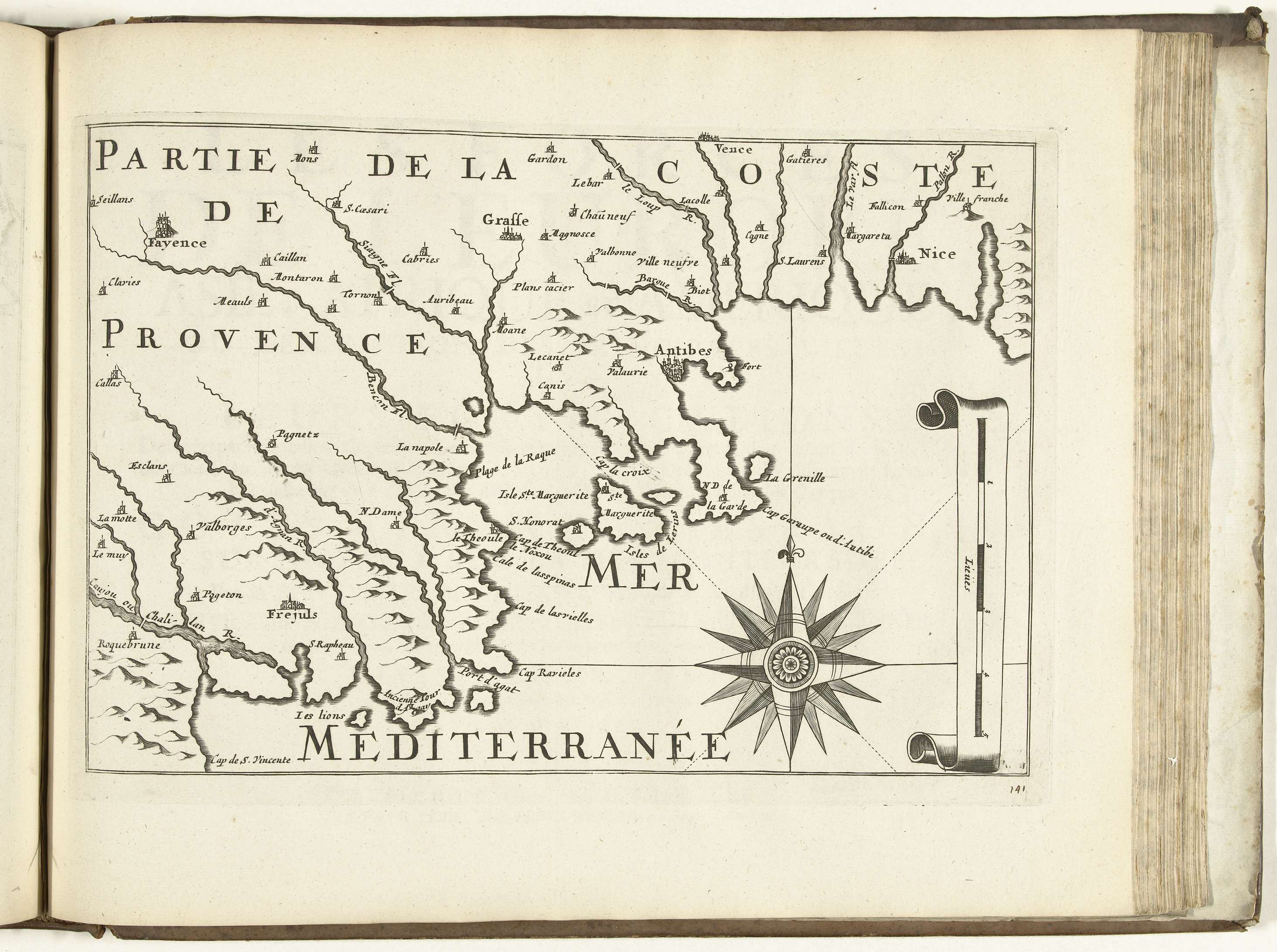 Kaart van de Franse zuidkust bij Antibes. Plaat nr. 141 in deel VI van het prentwerk: Les Forces de l'Europe, Asie, Afrique et Amerique ... Comme aussi les Cartes des Côtes de France et d'Espagne uit 1726, dit eerste deel met 238 met de hand genummerde platen van vermaarde sterke steden en vestingen in het ...
