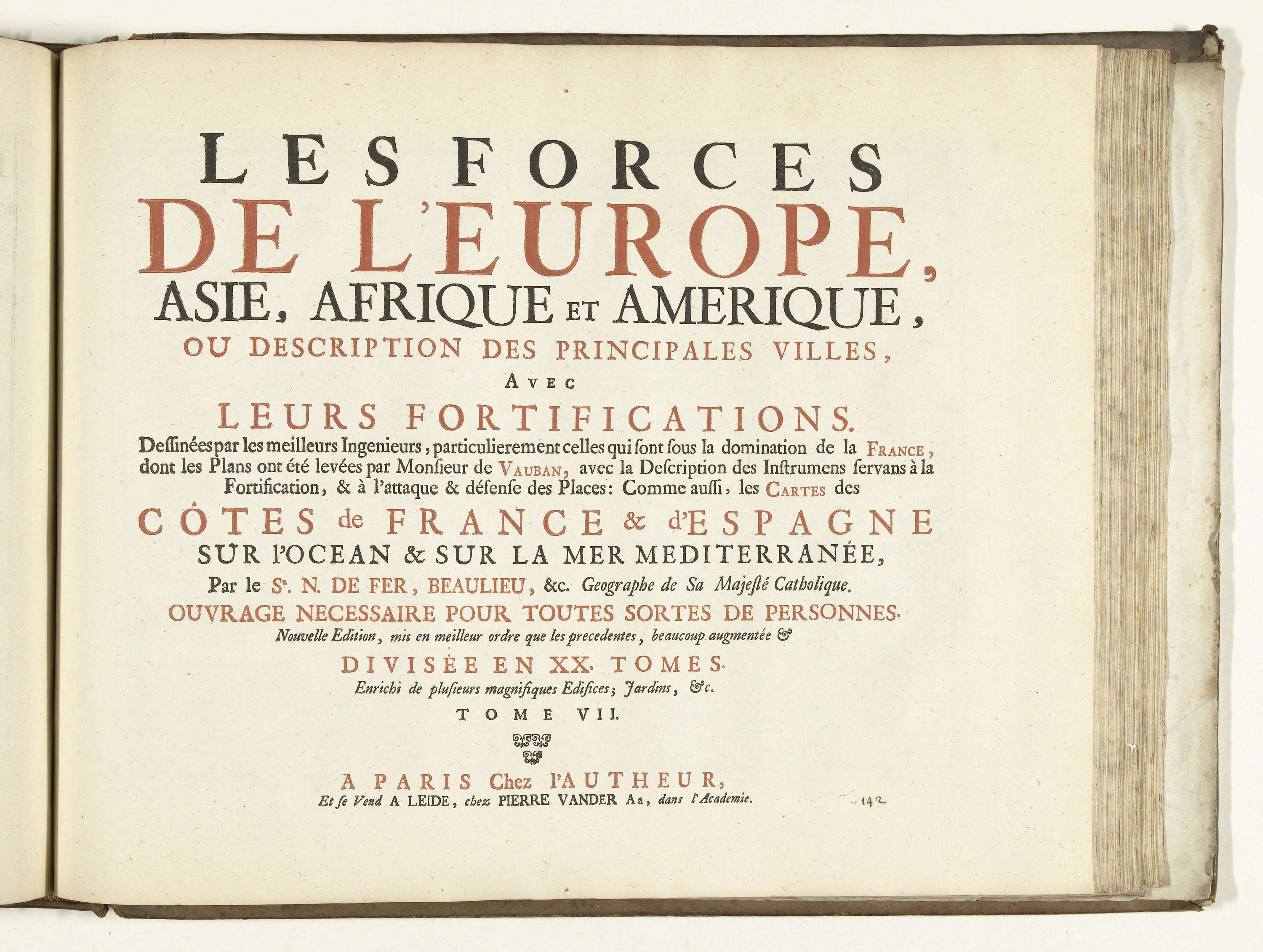 Titelpagina gedrukt in zwart en rood voor deel VII van het prentwerk Les Forces de l'Europe, Asie, Afrique et Amerique ... Comme aussi les Cartes des Côtes de France et d'Espagne, 1726. Dit eerste deel van het prentwerk bestaat uit 238 met de hand genummerde platen van vermaarde sterke steden en vestingen in het kader ...