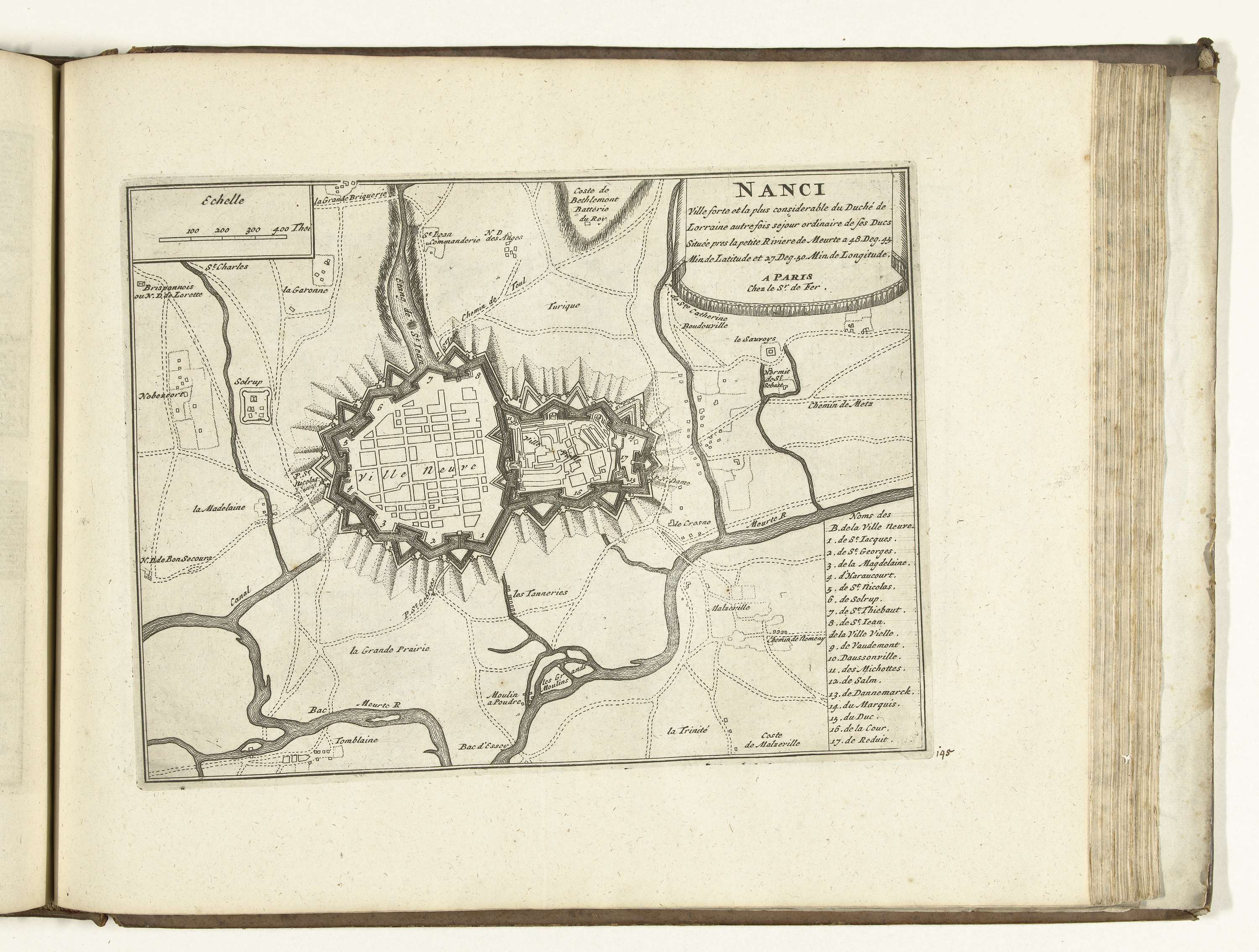 Plattegrond van de verdedigingswerken om de stad Nancy. Plaat nr. 145 in deel VII van het prentwerk: Les Forces de l'Europe, Asie, Afrique et Amerique ... Comme aussi les Cartes des Côtes de France et d'Espagne uit 1726, dit eerste deel met 238 met de hand genummerde platen van vermaarde sterke steden en vestingen in ...