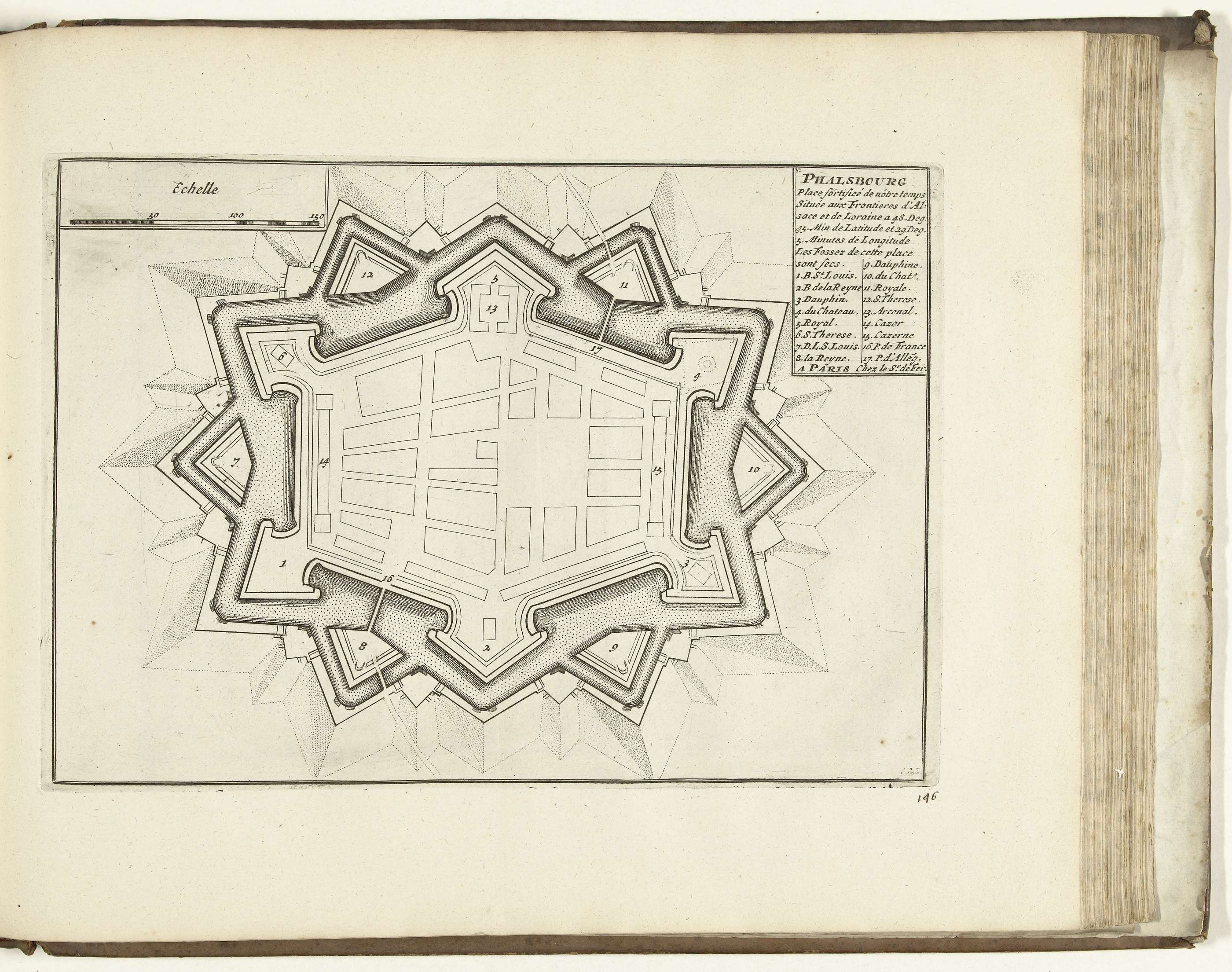 Plattegrond van de versterkingen om de stad Phalsbourg. Plaat nr. 146 in deel VII van het prentwerk: Les Forces de l'Europe, Asie, Afrique et Amerique ... Comme aussi les Cartes des Côtes de France et d'Espagne uit 1726, dit eerste deel met 238 met de hand genummerde platen van vermaarde sterke steden en vestingen in ...