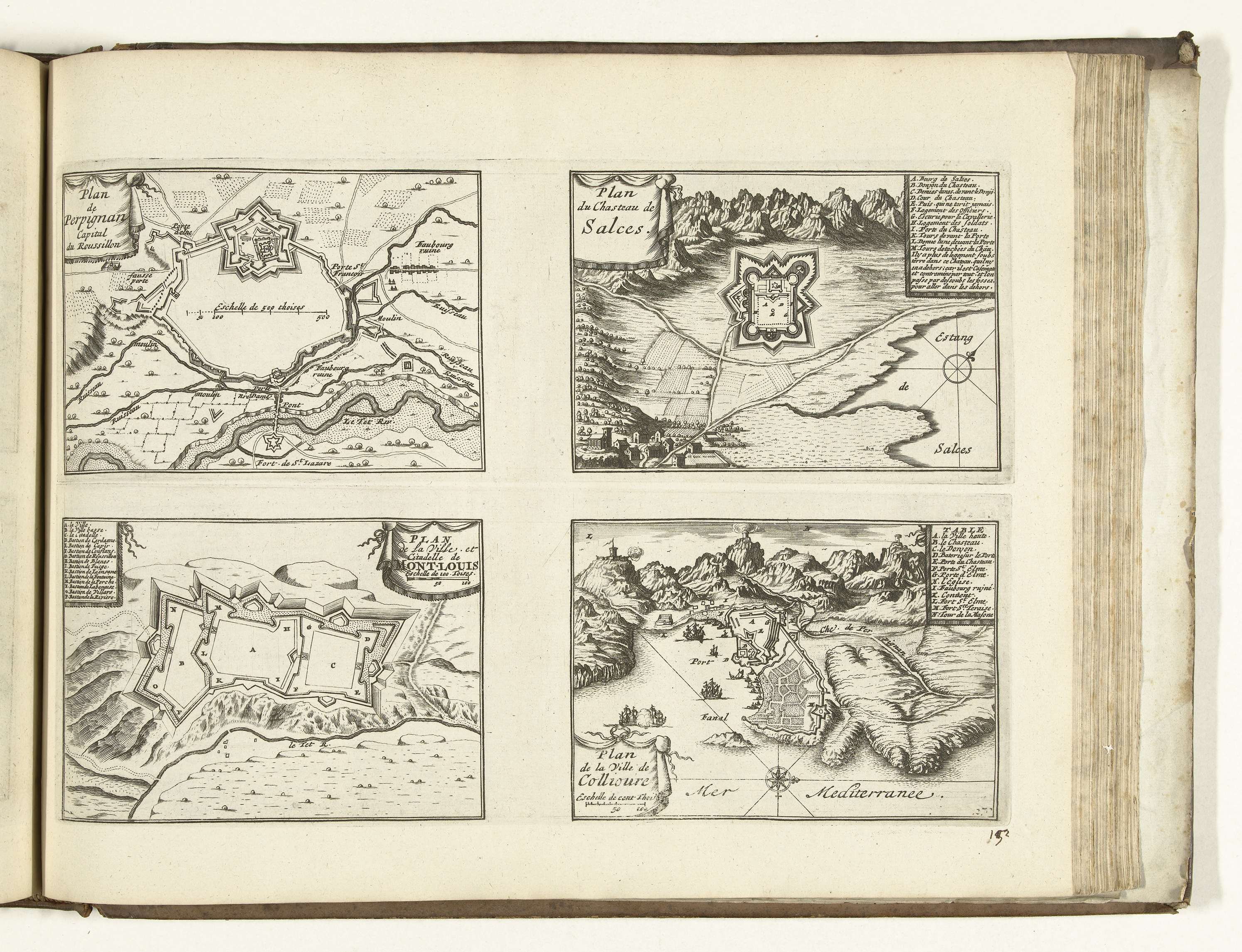 Blad met twee platen met elk twee plattegronden van de versterkingen om de Franse steden Perpignan, Salces, Mont-Louis en Collioure in Languedoc-Roussillon. Plaat nr. 152 in deel VII van het prentwerk: Les Forces de l'Europe, Asie, Afrique et Amerique ... Comme aussi les Cartes des Côtes de France et d'Espagne uit 1726, dit eerste deel ...