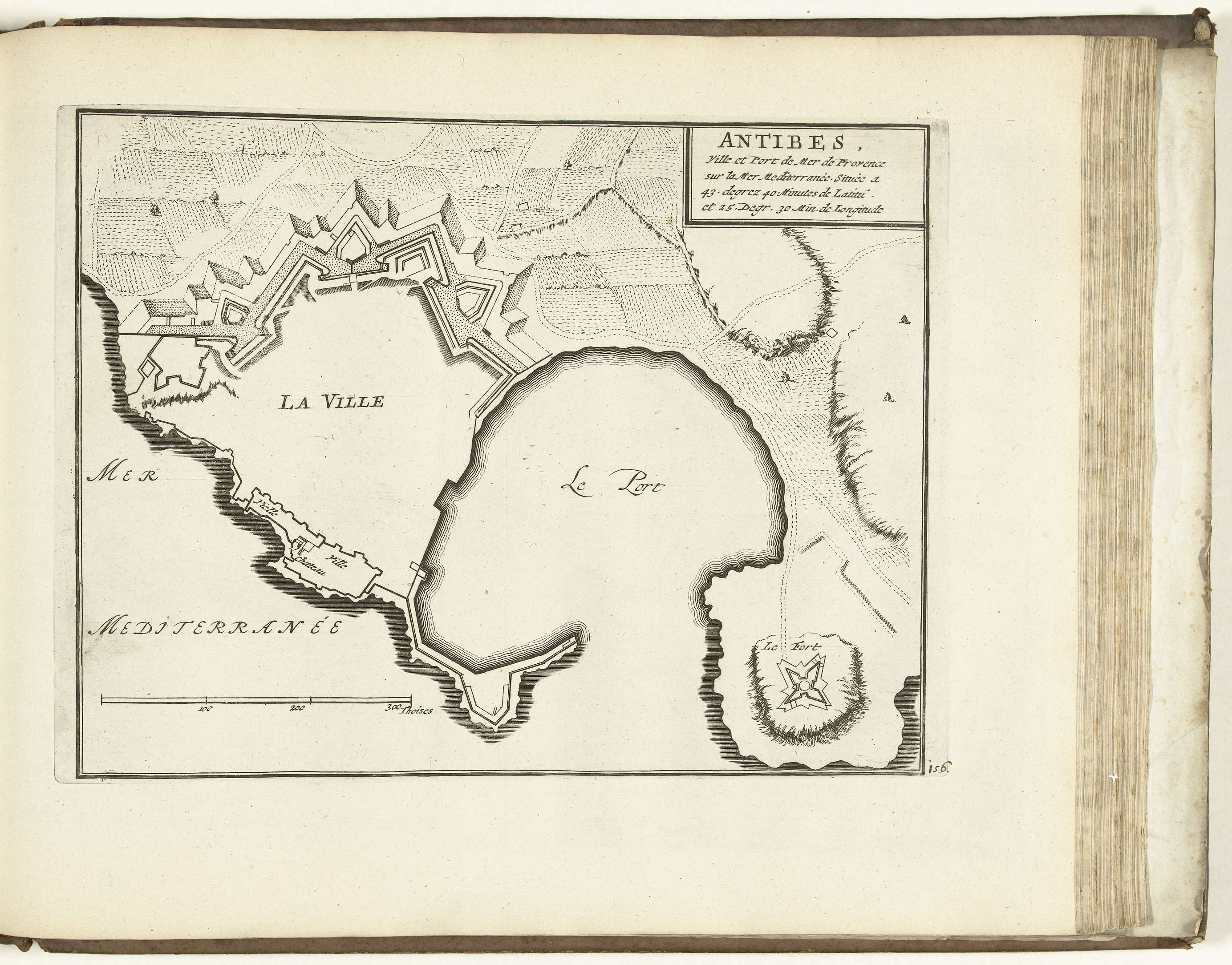 Plattegrond van de versterkingen om de Franse stad Antibes. Plaat nr. 156 in deel VII van het prentwerk: Les Forces de l'Europe, Asie, Afrique et Amerique ... Comme aussi les Cartes des Côtes de France et d'Espagne uit 1726, dit eerste deel met 238 met de hand genummerde platen van vermaarde sterke steden en vestingen ...