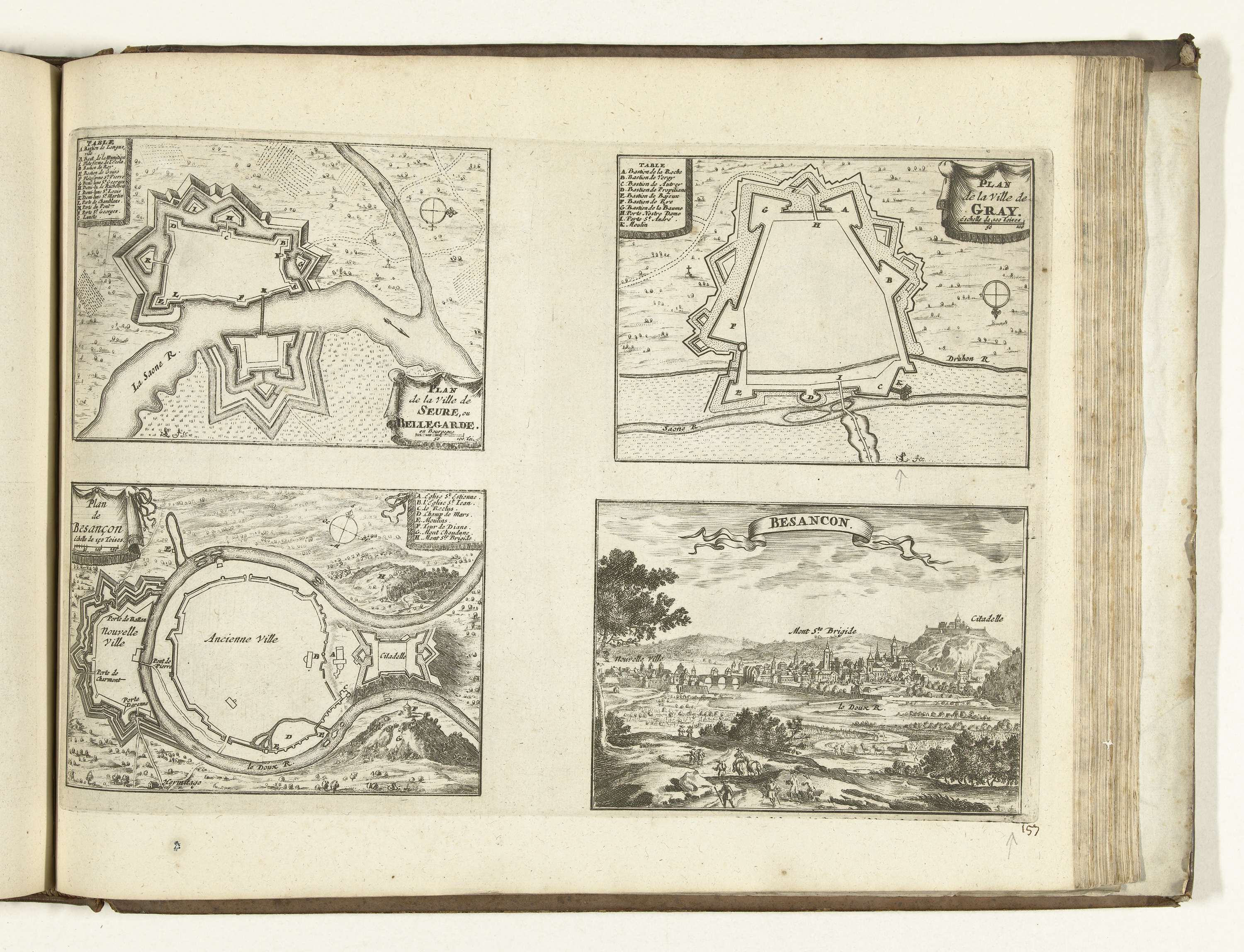 Blad met drie plattegronden van de verdedigingswerken om de steden Seurre, Gray en Besançon en een gezicht op Besançon. Plaat nr. 157 in deel VII van het prentwerk: Les Forces de l'Europe, Asie, Afrique et Amerique ... Comme aussi les Cartes des Côtes de France et d'Espagne uit 1726, dit eerste deel met 238 met ...