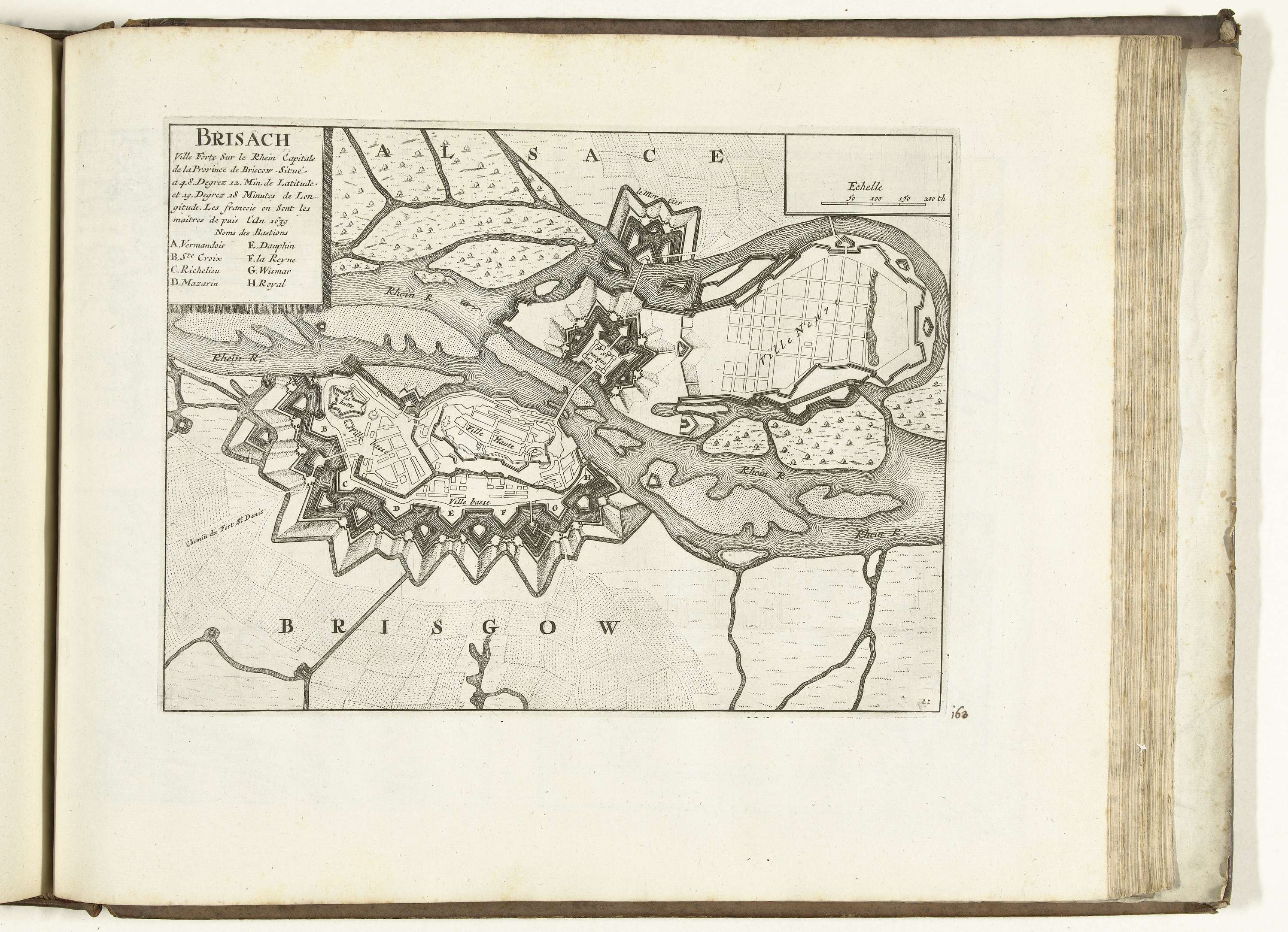 Plattegrond van de versterkingen om de Duitse stad Breisach. Plaat nr. 163 in deel VII van het prentwerk: Les Forces de l'Europe, Asie, Afrique et Amerique ... Comme aussi les Cartes des Côtes de France et d'Espagne uit 1726, dit eerste deel met 238 met de hand genummerde platen van vermaarde sterke steden en vestingen ...